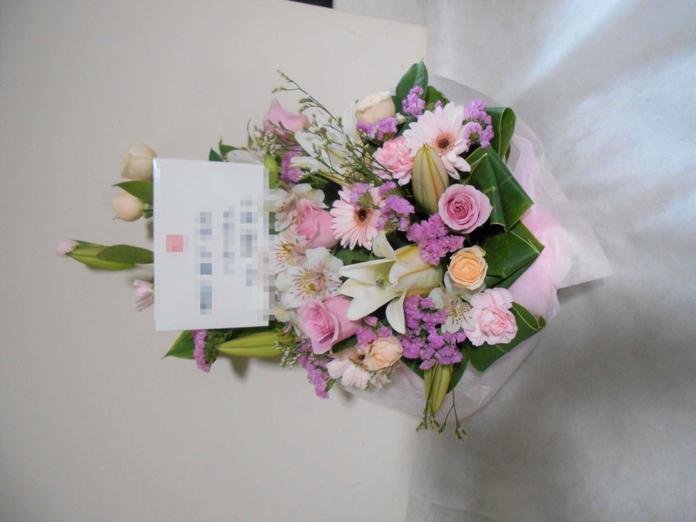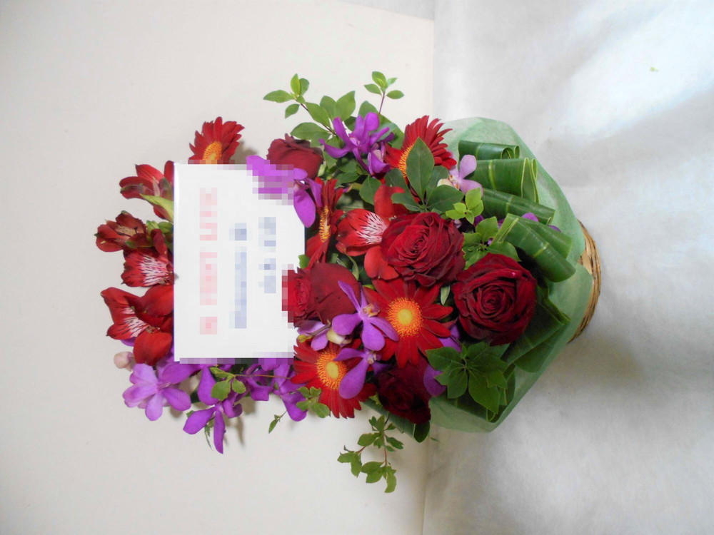 アレンジメントの実際にお届けした写真です。花秘書では発送前に写真をメールで送信致しますので安心して大切な顧客や取引様へのギフトにご利用頂けます。