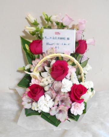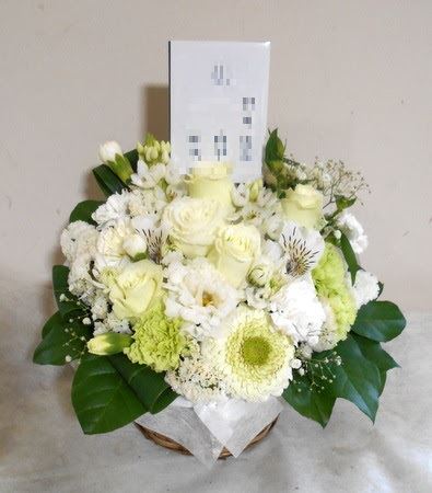 お悔やみ お供えの花 供花 (白バラと季節のお花のバスケットアレンジ)