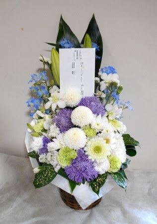 お悔やみ お供えの花 供花 (ホワイト&青・紫系カラーのお花でまとめたバスケットアレンジ)