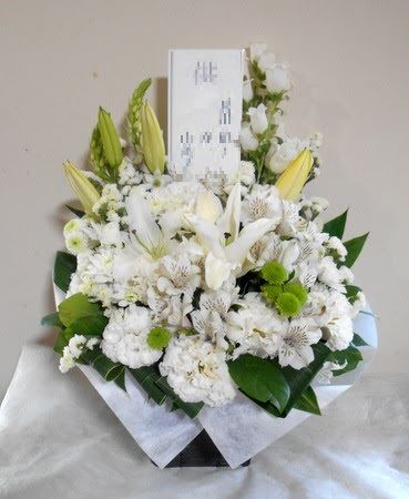 お悔やみ お供えの花 供花 (白ユリをメインにホワイト系にまとめた高さのあるバスケットアレンジ)
