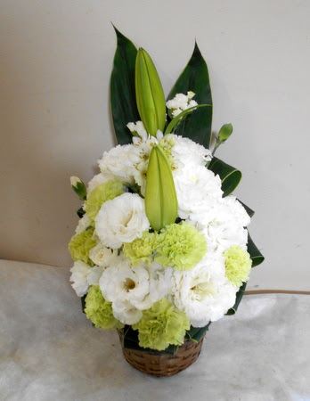 お悔やみ お供えの花 供花 (白ユリをメインにホワイト&グリーンでまとめたバスケットアレンジ)