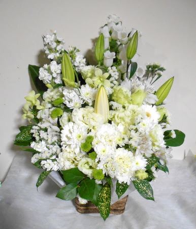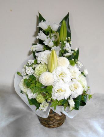 お悔やみ お供えの花 供花 (白基調でユリのお花をメインにしたバスケットアレンジ)
