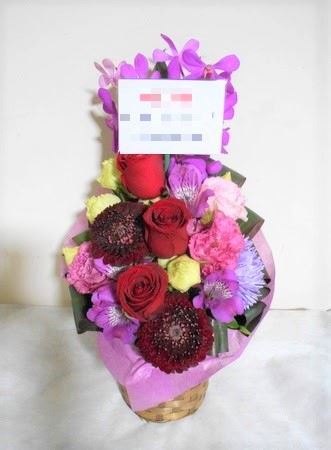 アレンジメントの実際にお届けした写真です。花秘書では発送前に写真をメールで送信致しますので安心して大切な顧客や取引様へのギフトにご利用頂けます。