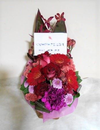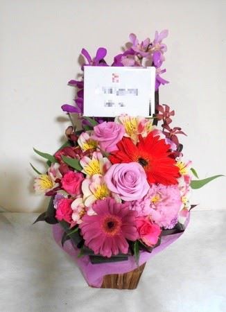 アレンジメントの実際にお届けした写真です。花秘書では発送前に写真をメールで送信致しますので安心して大切な顧客や取引様へのギフトにご利用頂けます。