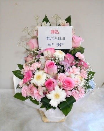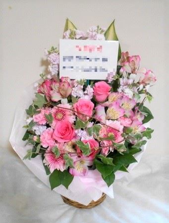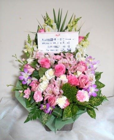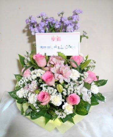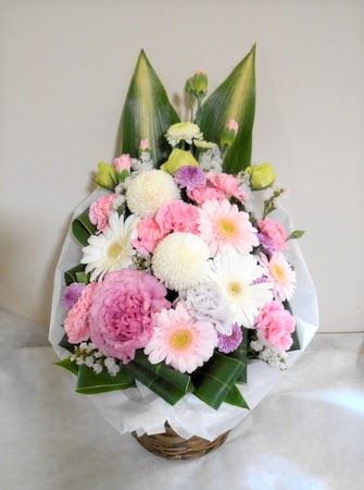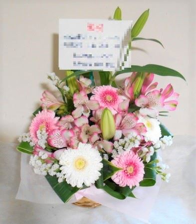 お悔やみ お供えの花 供花 (淡いピンク系のお花でまとめたバスケットアレンジ)