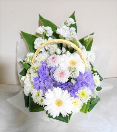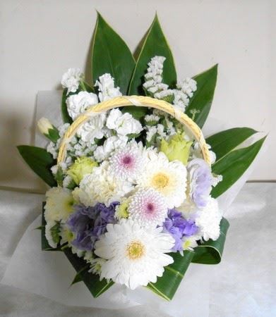 お悔やみ お供えの花 供花 (ホワイト&淡色カラーの手付きバスケットアレンジ)
