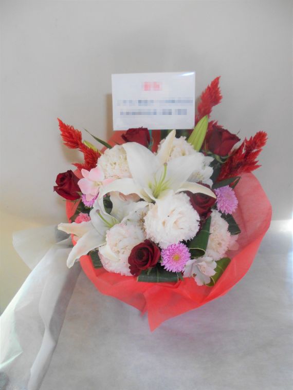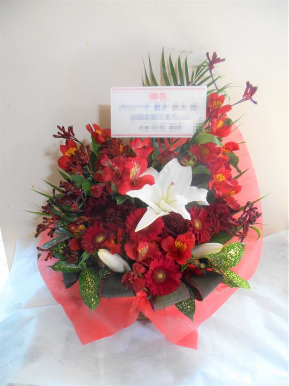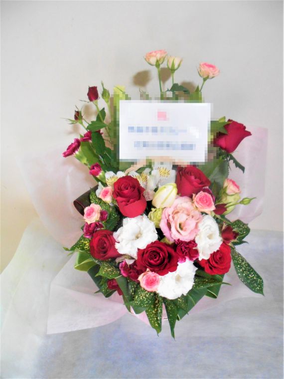 アレンジメントの実際にお届けした写真です。花秘書では発送前に写真をメールで送信致しますので安心して大切な顧客や取引様へのギフトにご利用頂けます。