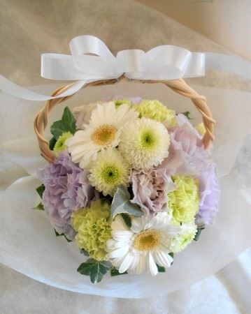 お悔やみ お供えの花 供花 (ホワイト&薄紫系でまとめた手付きのバスケットアレンジ)