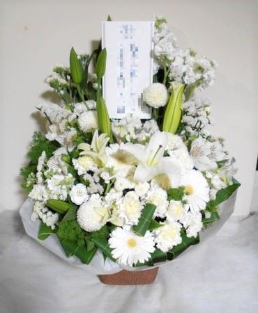お悔やみ お供えの花 供花 (白ユリをメインにホワイト系にまとめた高さのあるバスケットアレンジ)