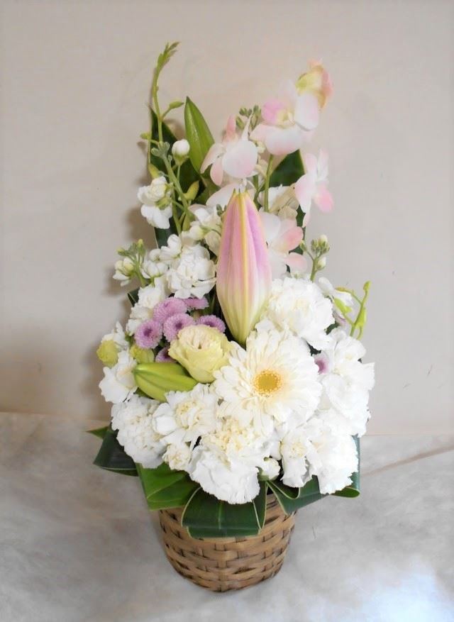 【白系】お悔やみ お供えの花 供花 (ピンクのユリをメインにして白系でまとめたバスケットアレンジ)