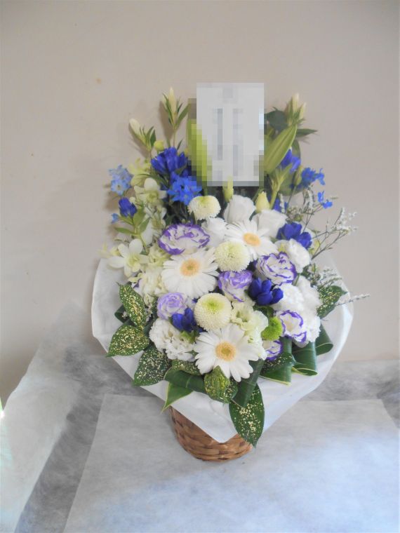 お悔やみ お供えの花 供花 (ホワイト&青・紫系カラーのお花でまとめたバスケットアレンジ)