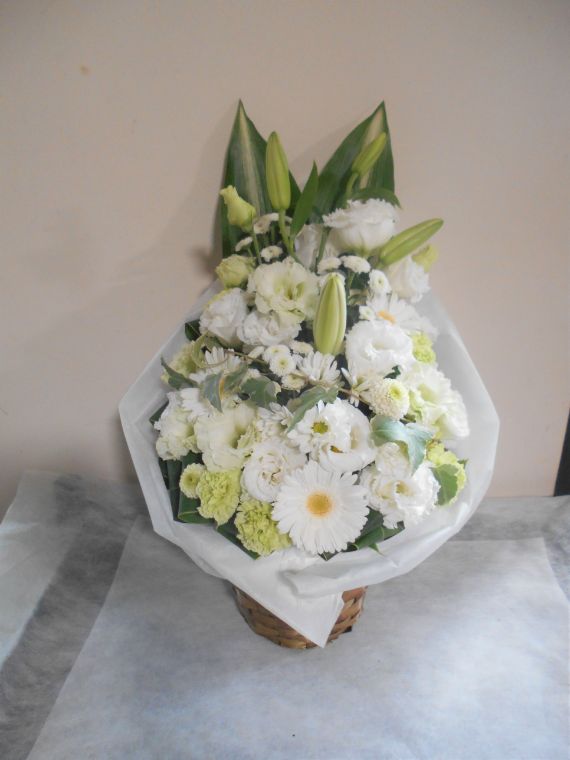 お悔やみ お供えの花 供花 (ホワイト&グリーンでまとめたバスケットアレンジ)