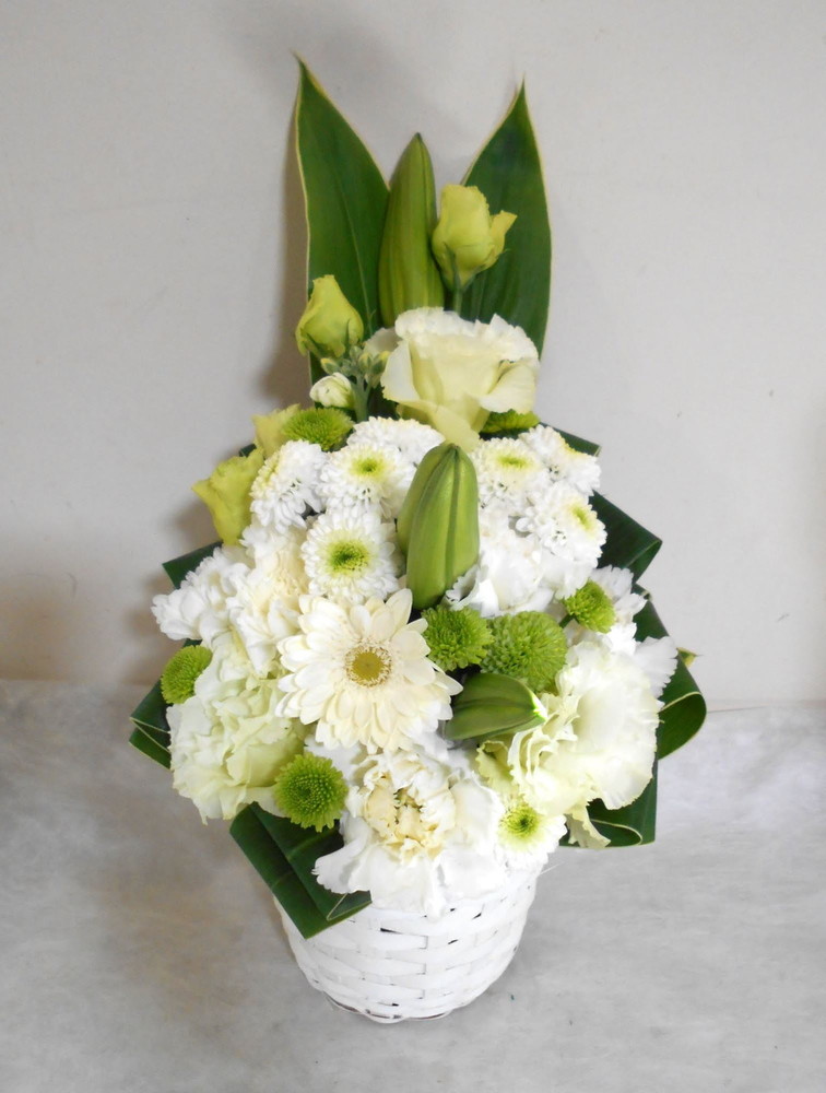 お悔やみ お供えの花 供花 (白ユリをメインにホワイト&グリーンでまとめたバスケットアレンジ)