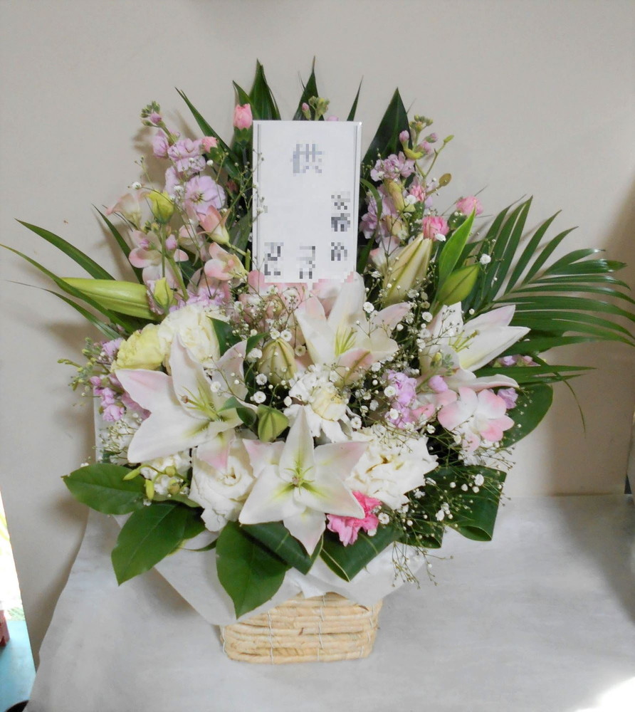お悔やみ お供えの花 供花 (ユリをメインに白&ピンクでまとめたバスケットアレンジ)