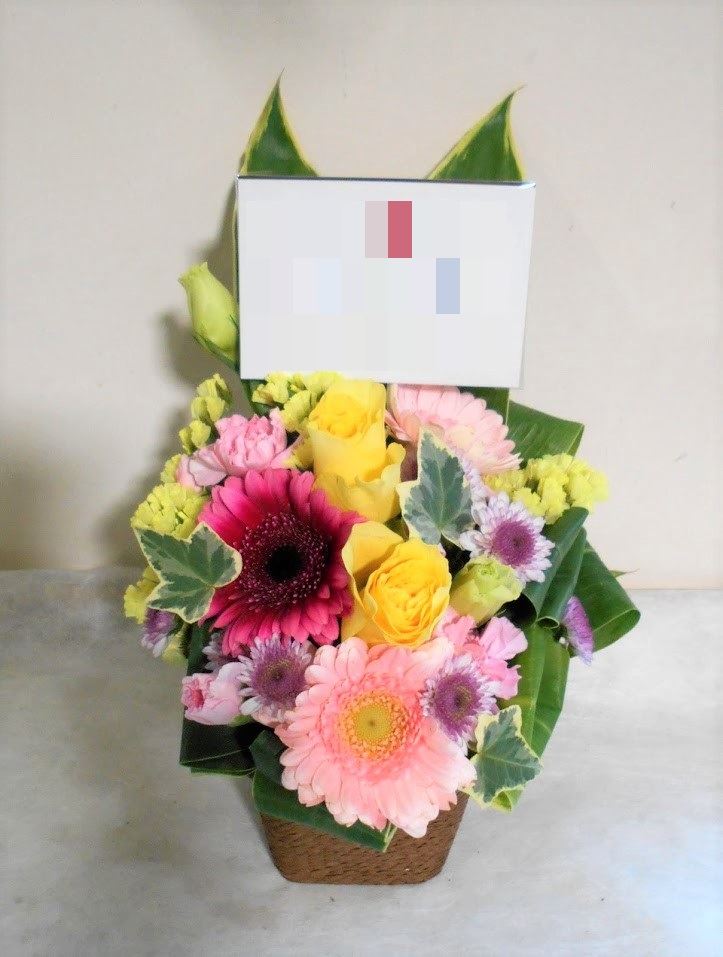 アレンジメントの実際にお届けした写真です。花秘書では発送前に写真をメールで送信致しますので安心して大切な顧客や取引様へのギフトにご利用頂けます。