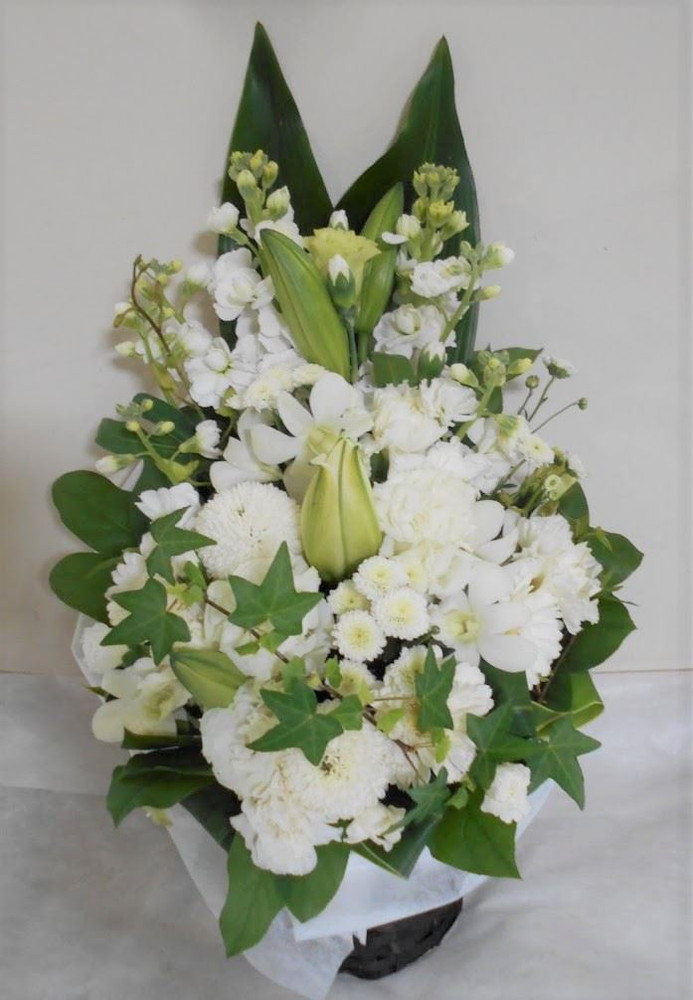 お悔やみ お供えの花 供花 (白基調でユリのお花をメインにしたバスケットアレンジ)