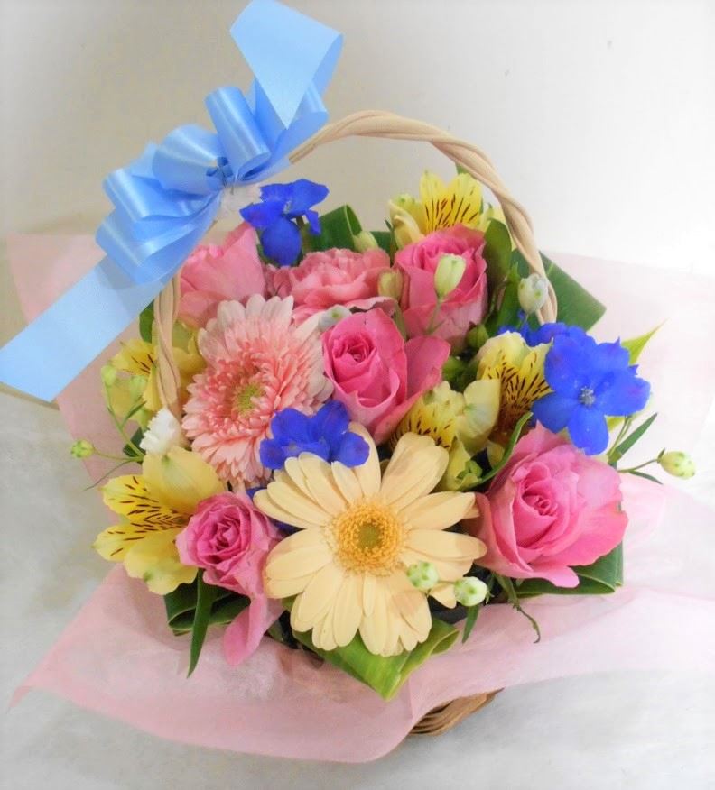お悔やみ お供えの花 供花 (淡いピンク系のお花でまとめたバスケットアレンジ)