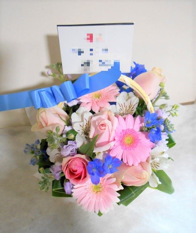 アレンジメントの実際にお届けした写真です。花秘書では発送前に写真をメールで送信致しますので安心して大切な顧客や取引様へのギフトにご利用頂けます。