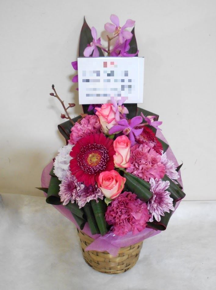 お悔やみ お供えの花 供花 (白ユリをメインにピンクの洋蘭をあしらった高さのあるバスケットアレンジ)