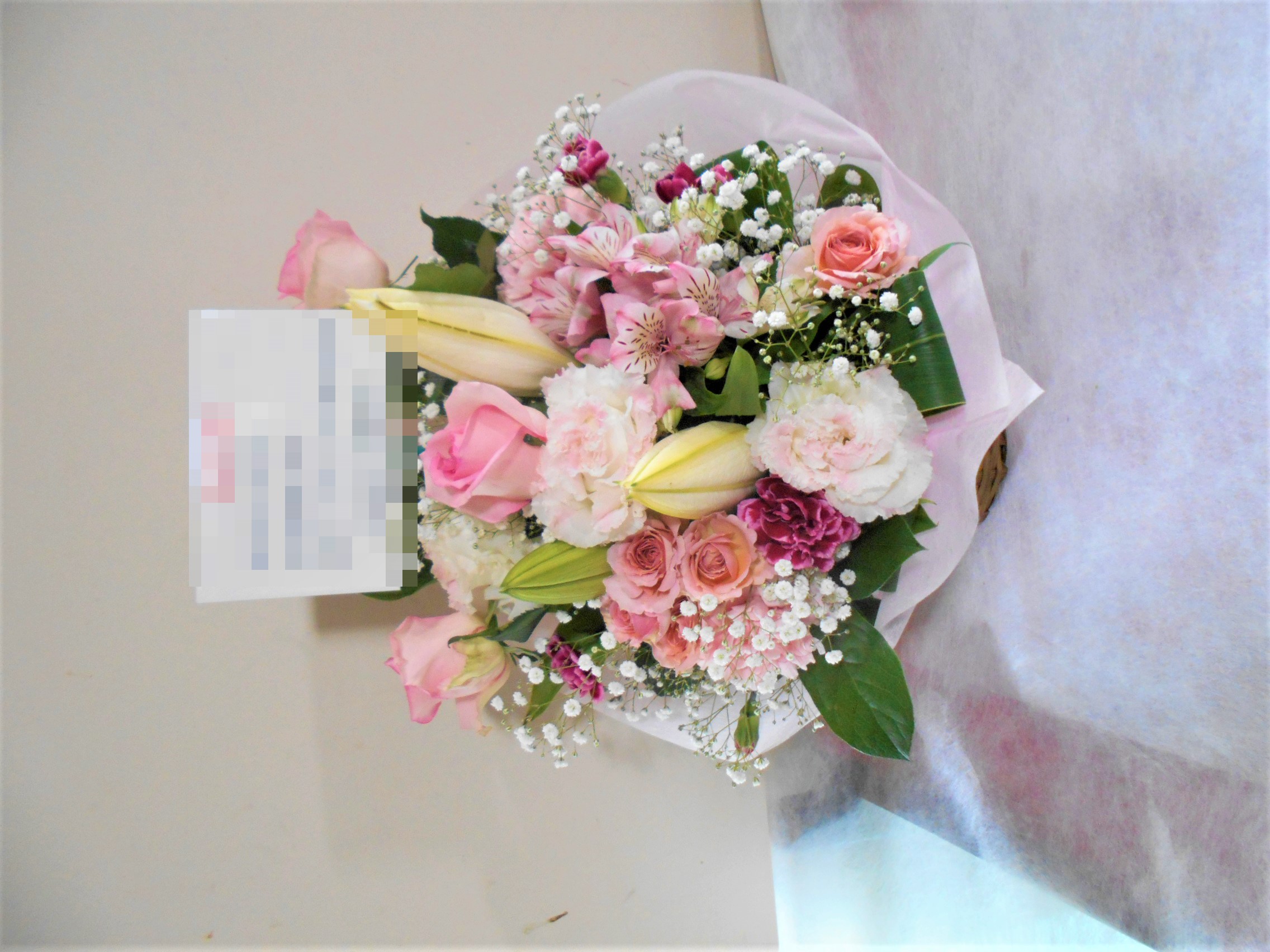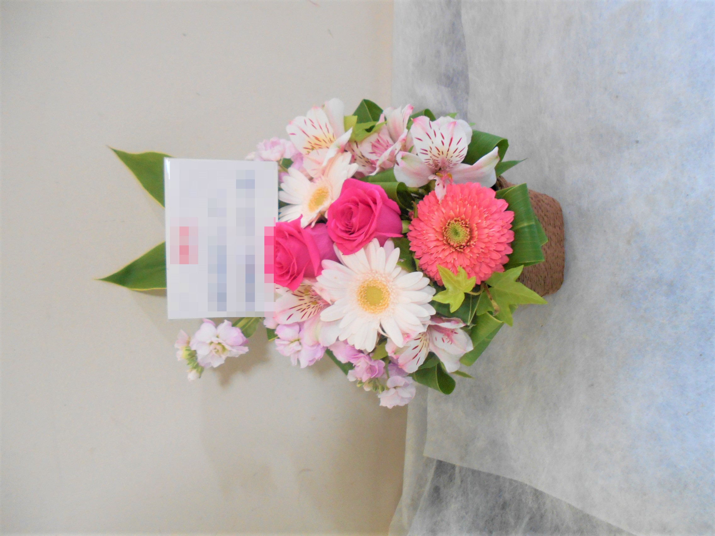 アレンジメントの実際にお届けした写真です。花秘書では発送前に写真をメールで送信致しますので安心して大切な顧客や取引様へのギフトにご利用頂けます。