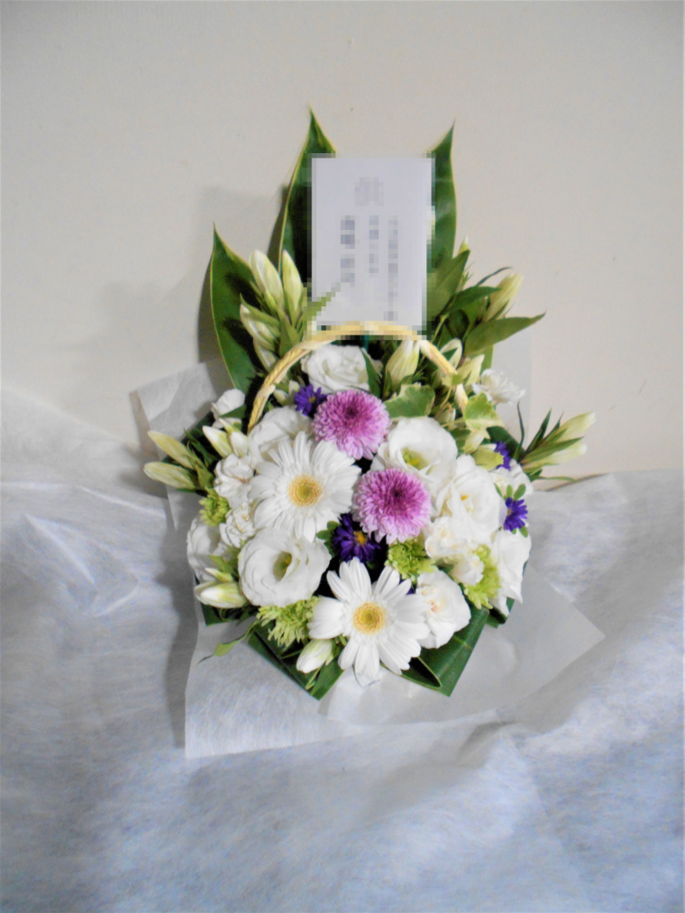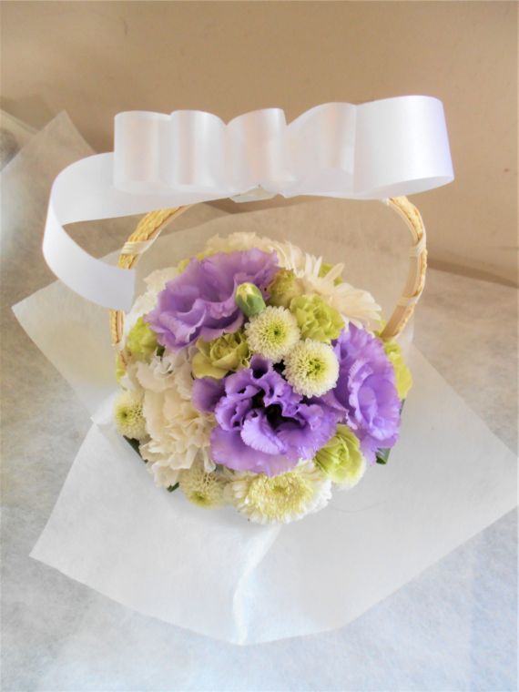 お悔やみ お供えの花 供花 (ホワイト&薄紫系でまとめた手付きのバスケットアレンジ)