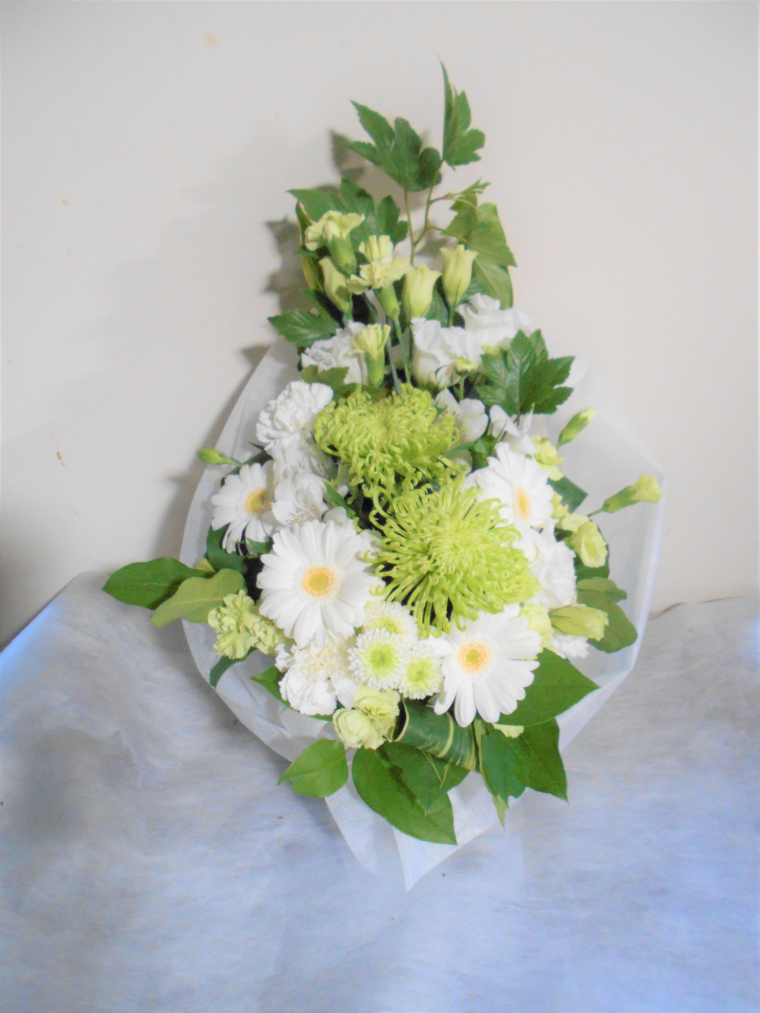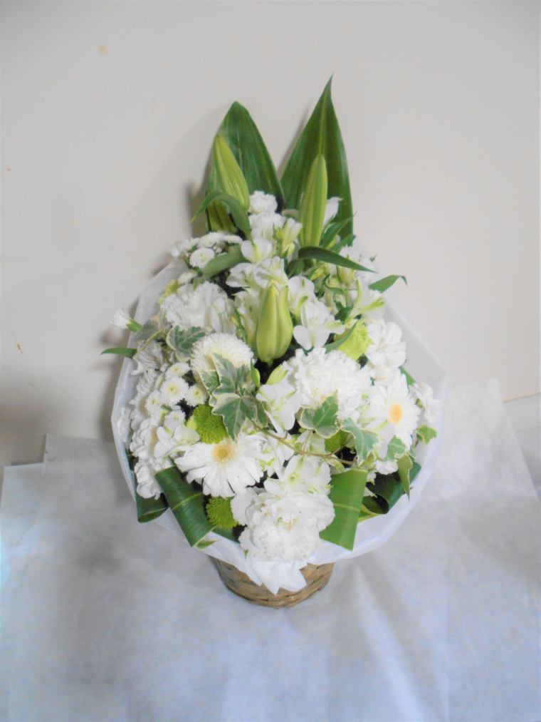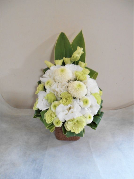 お悔やみ お供えの花 供花 (ホワイト&グリーンでまとめたバスケットアレンジ)