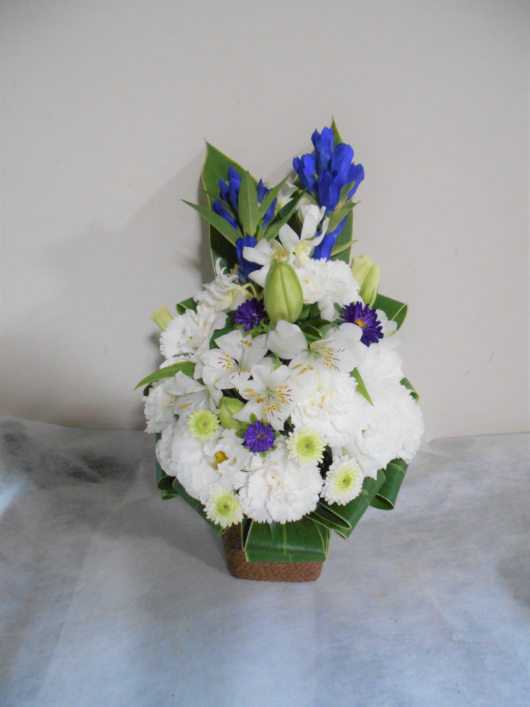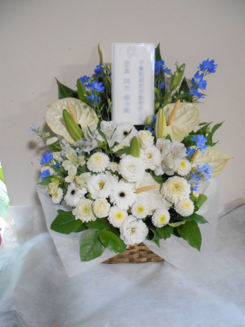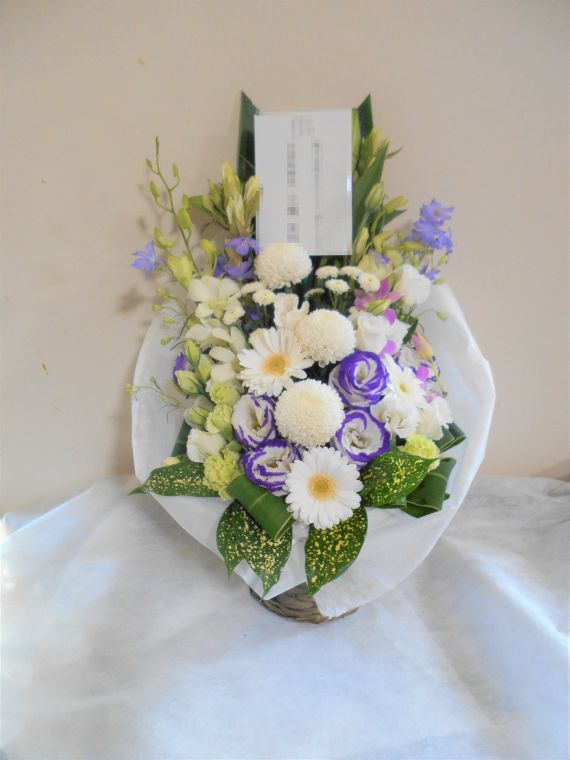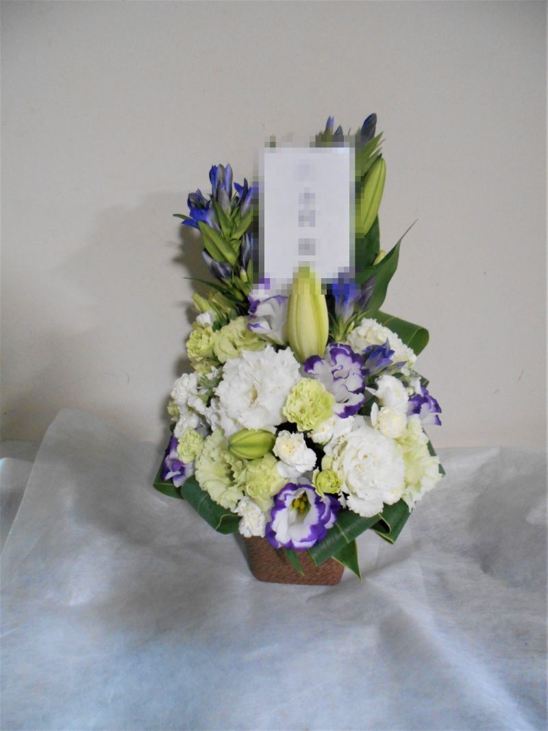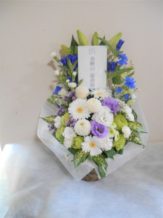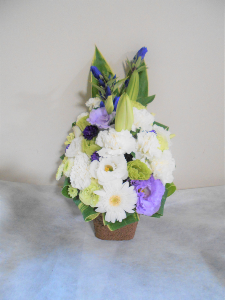 お悔やみ お供えの花 供花 (ホワイト&青・紫系カラーのお花でまとめたバスケットアレンジ)