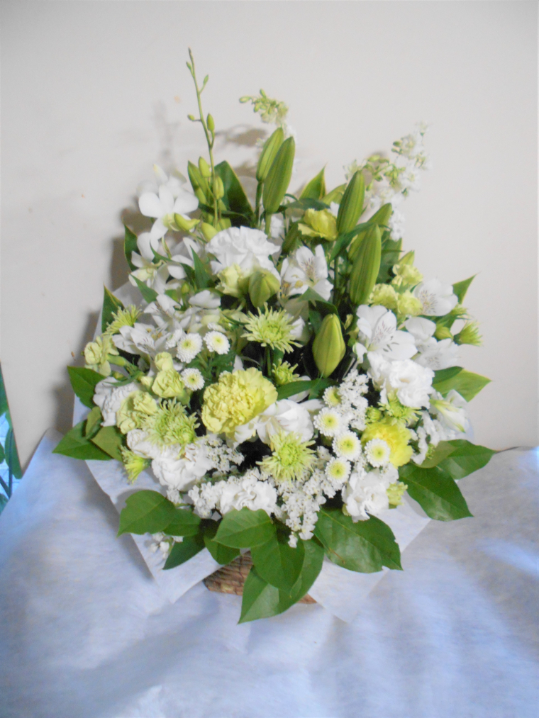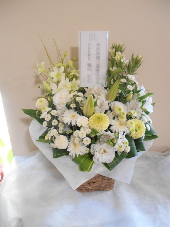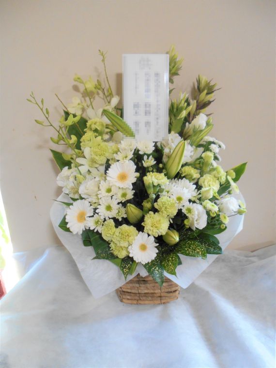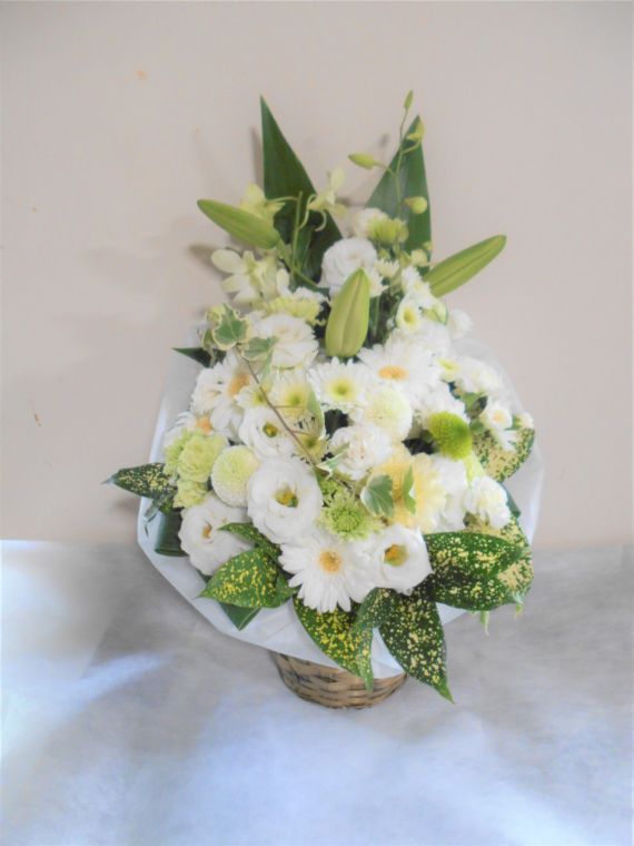 お悔やみ お供えの花 供花 (ホワイト&グリーンを基調にしたバスケットアレンジ)