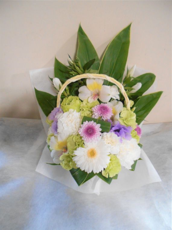 お悔やみ お供えの花 供花 (ホワイト&淡色カラーの手付きバスケットアレンジ)