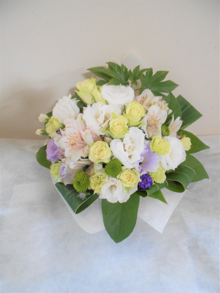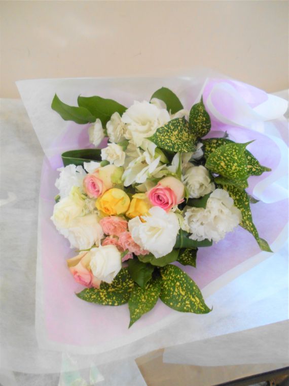 【白系】お悔やみ お供えの花 供花 (ピンクのバラと白いお花でまとめた優しい花束)
