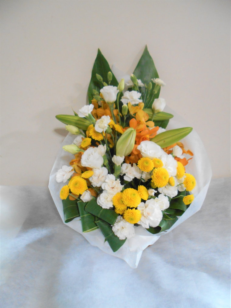 お悔やみ お供えの花 供花 (白ユリをメインに黄色の洋蘭をあしらったバスケットアレンジ)