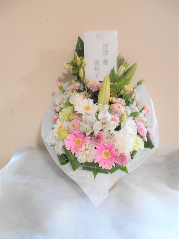 お悔やみ お供えの花 供花 (ピンクのバラと白いお花でまとめた優しい花束)