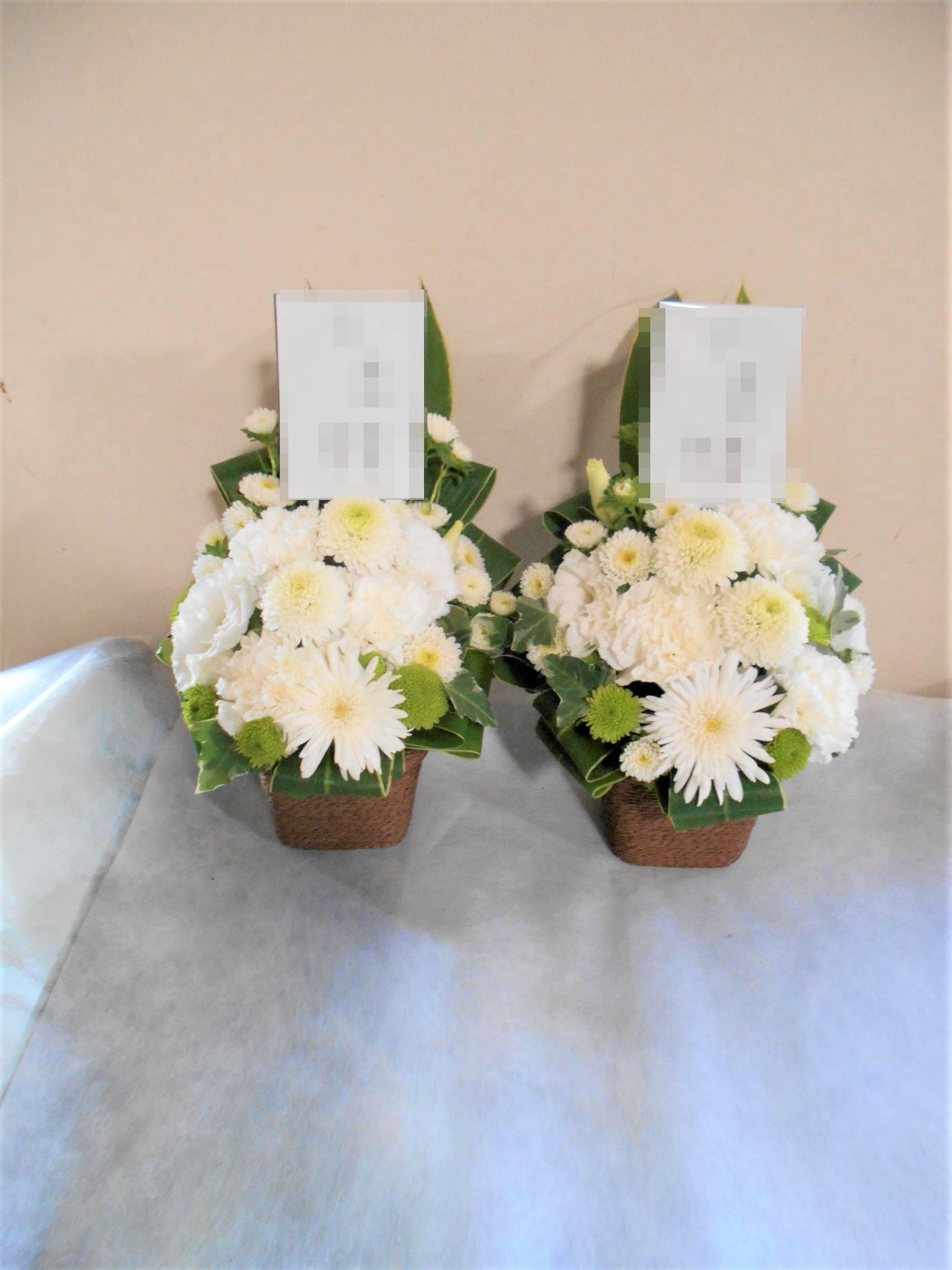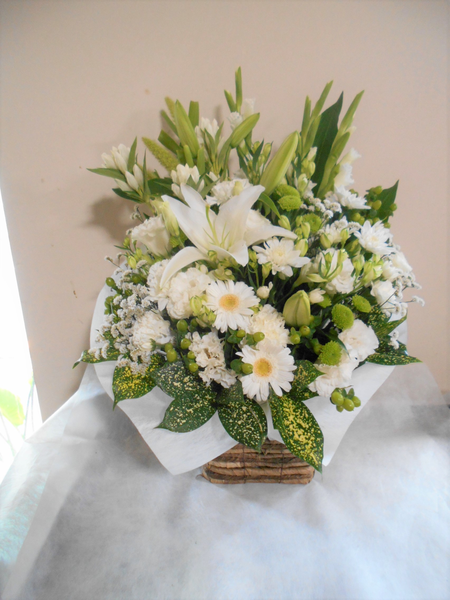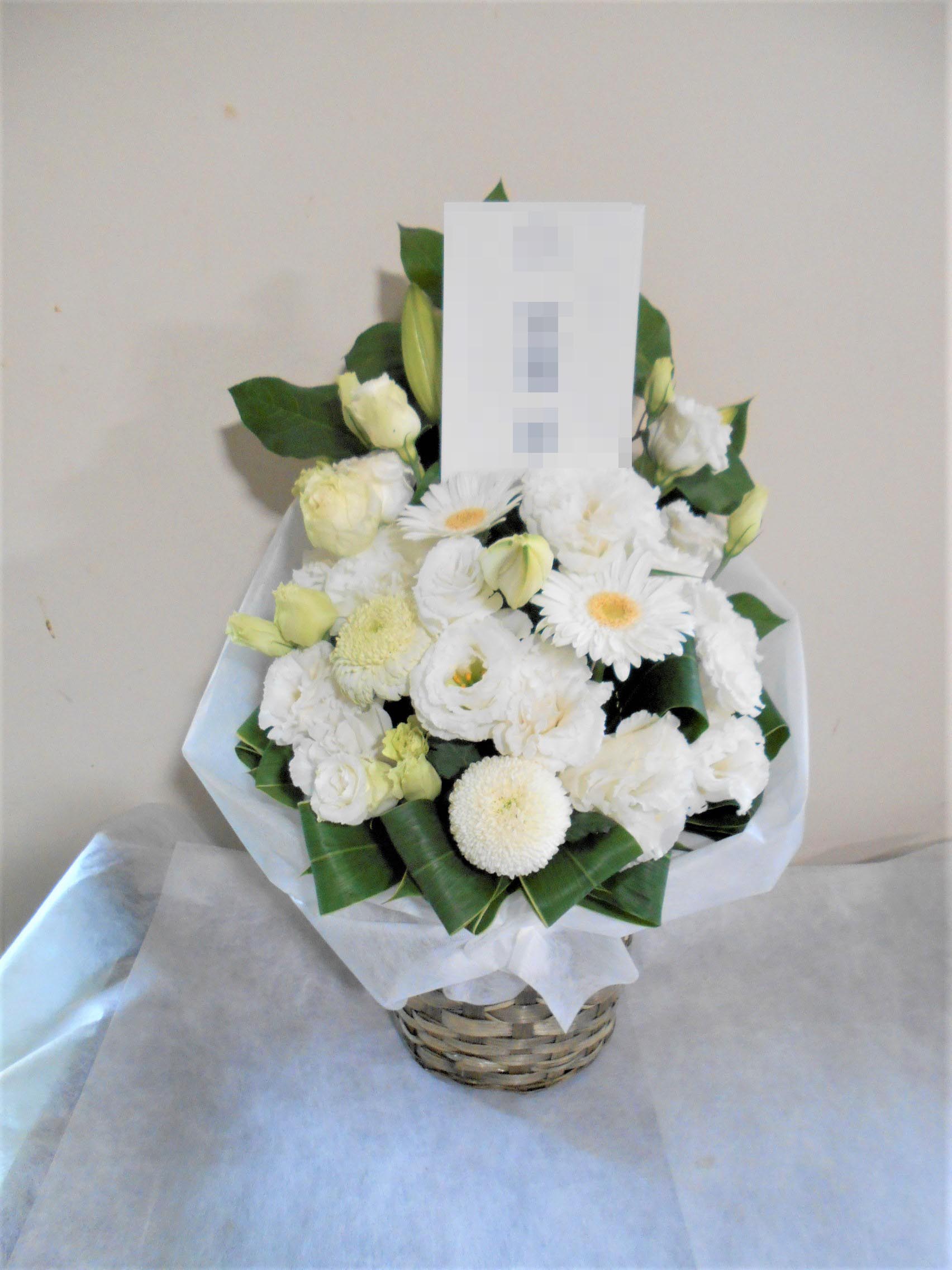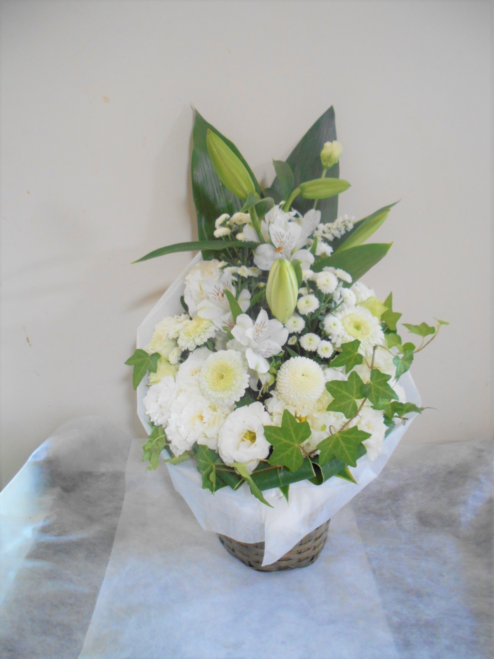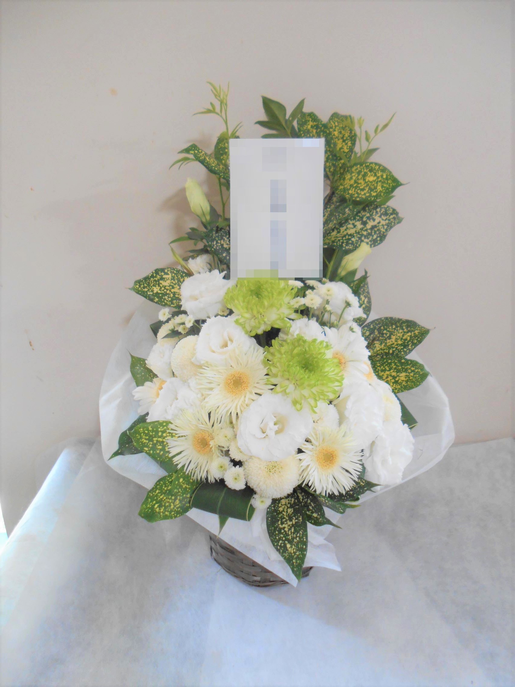 お悔やみ お供えの花 供花 (ホワイト&グリーンでまとめたバスケットアレンジ)