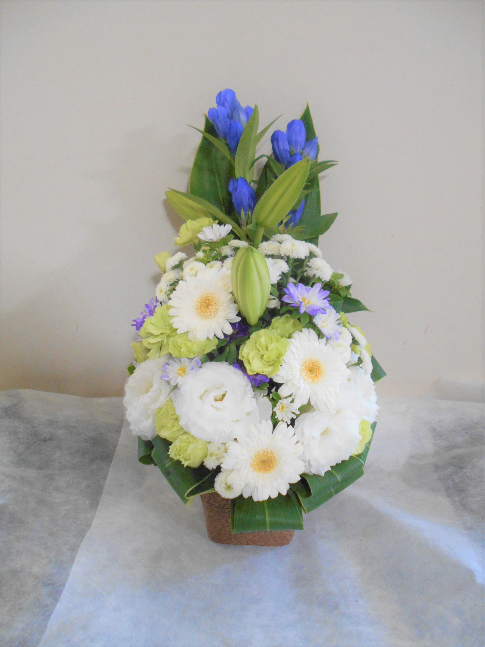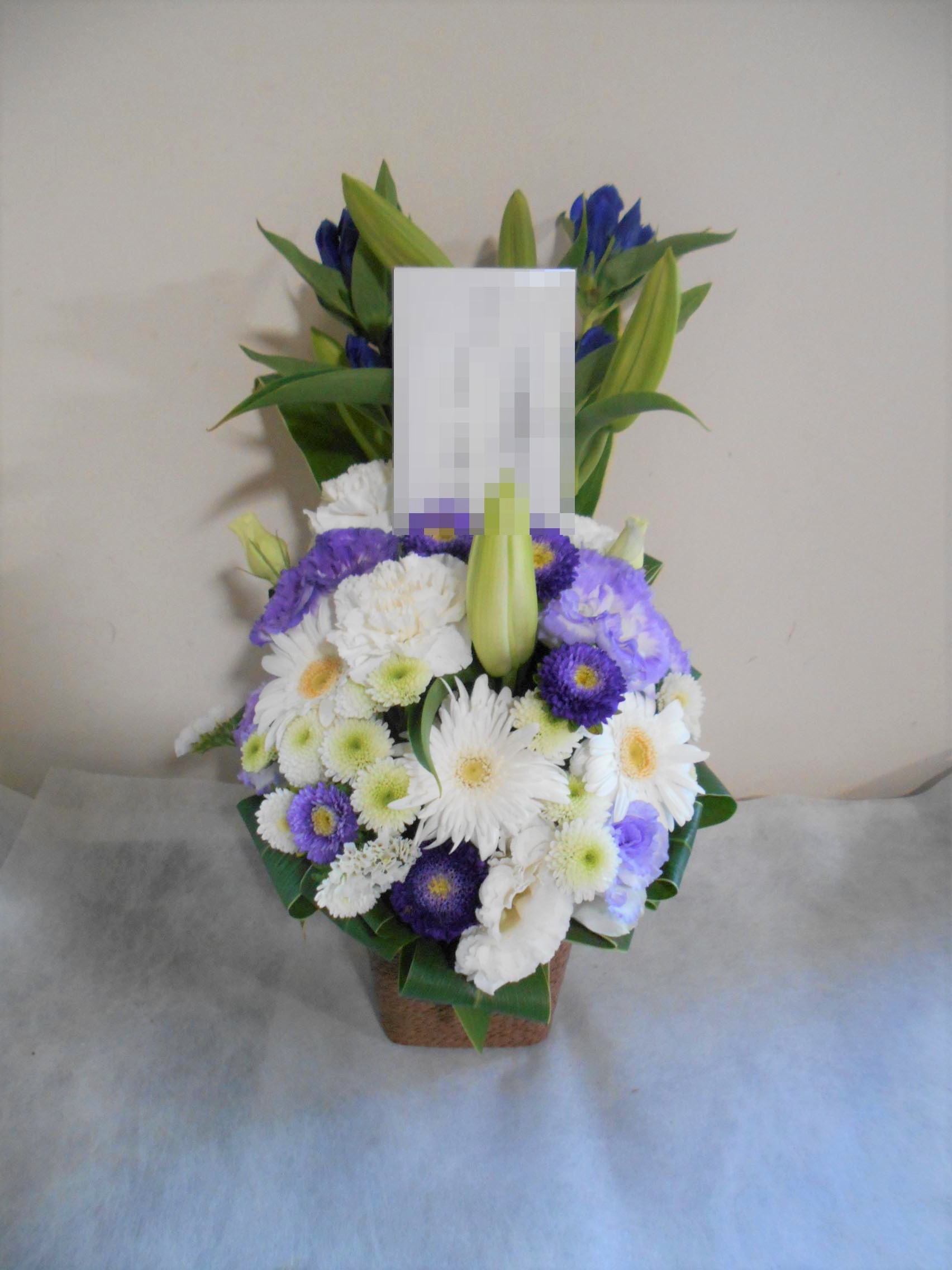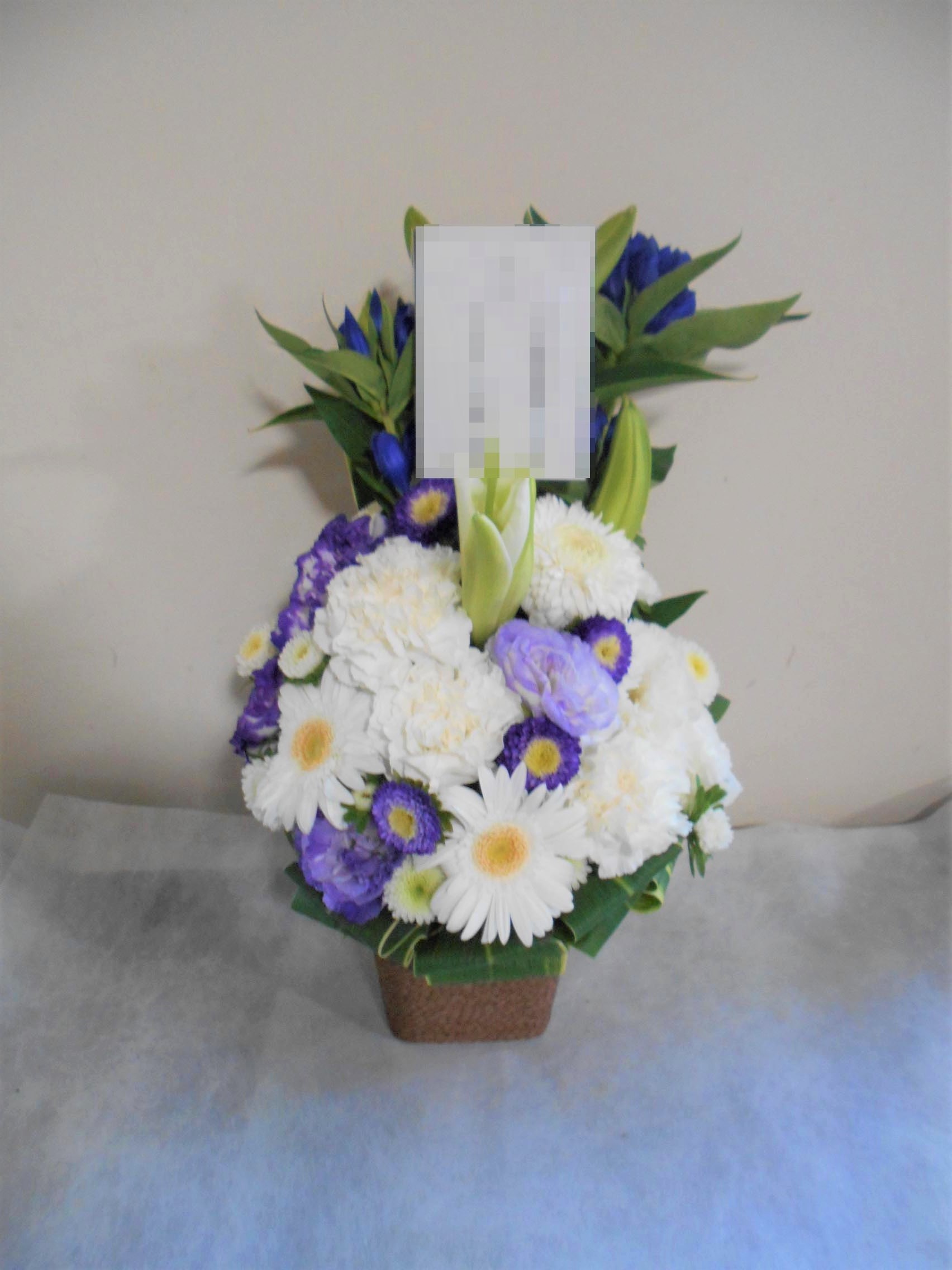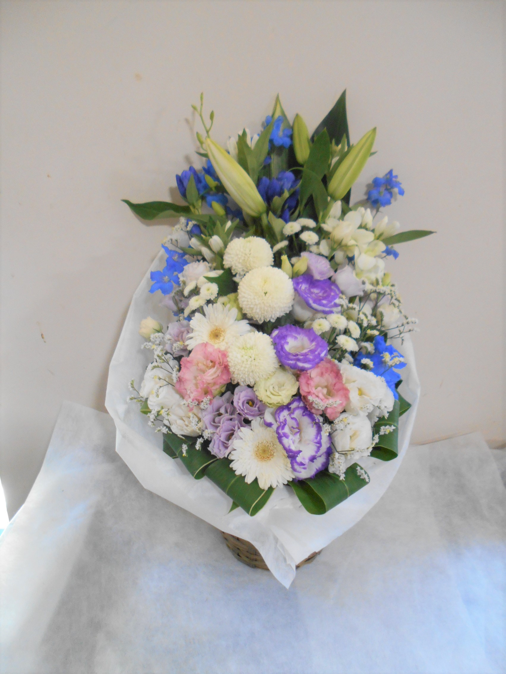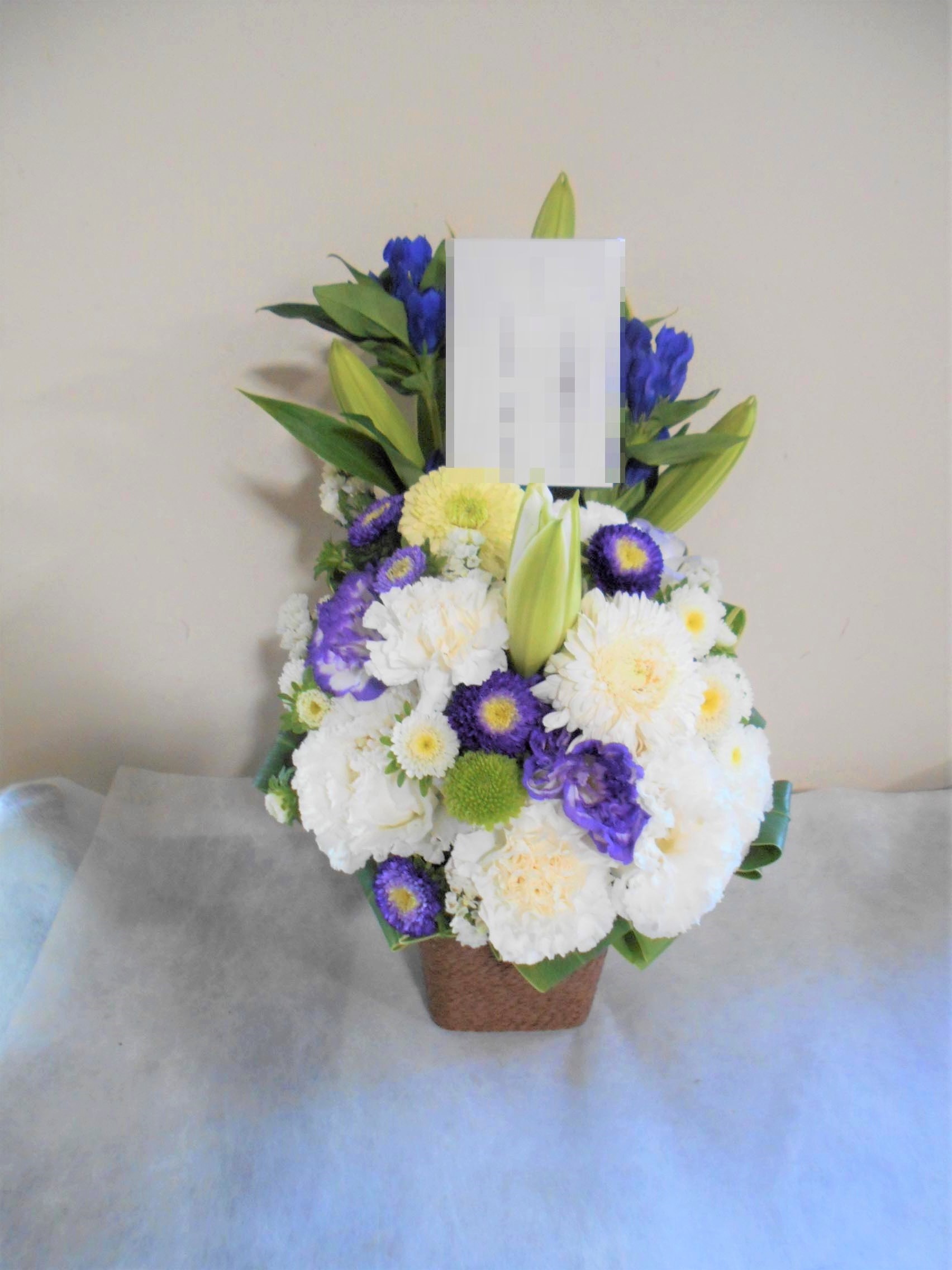 お悔やみ お供えの花 供花 (ホワイト&青・紫系カラーのお花でまとめたバスケットアレンジ)
