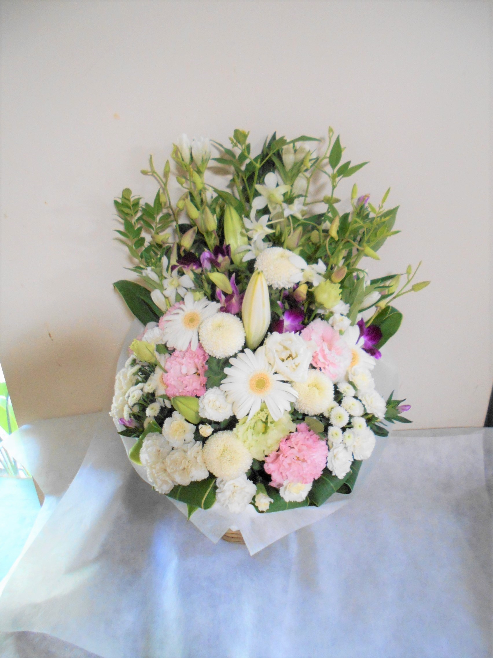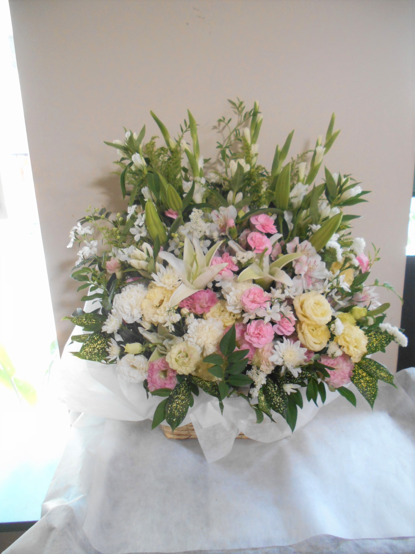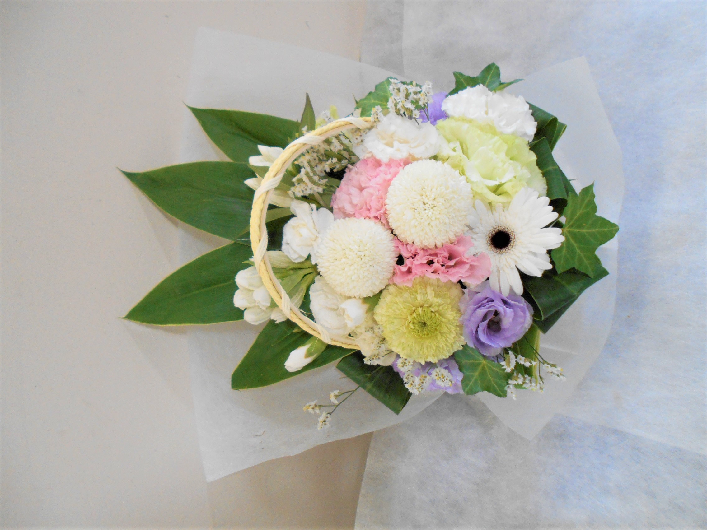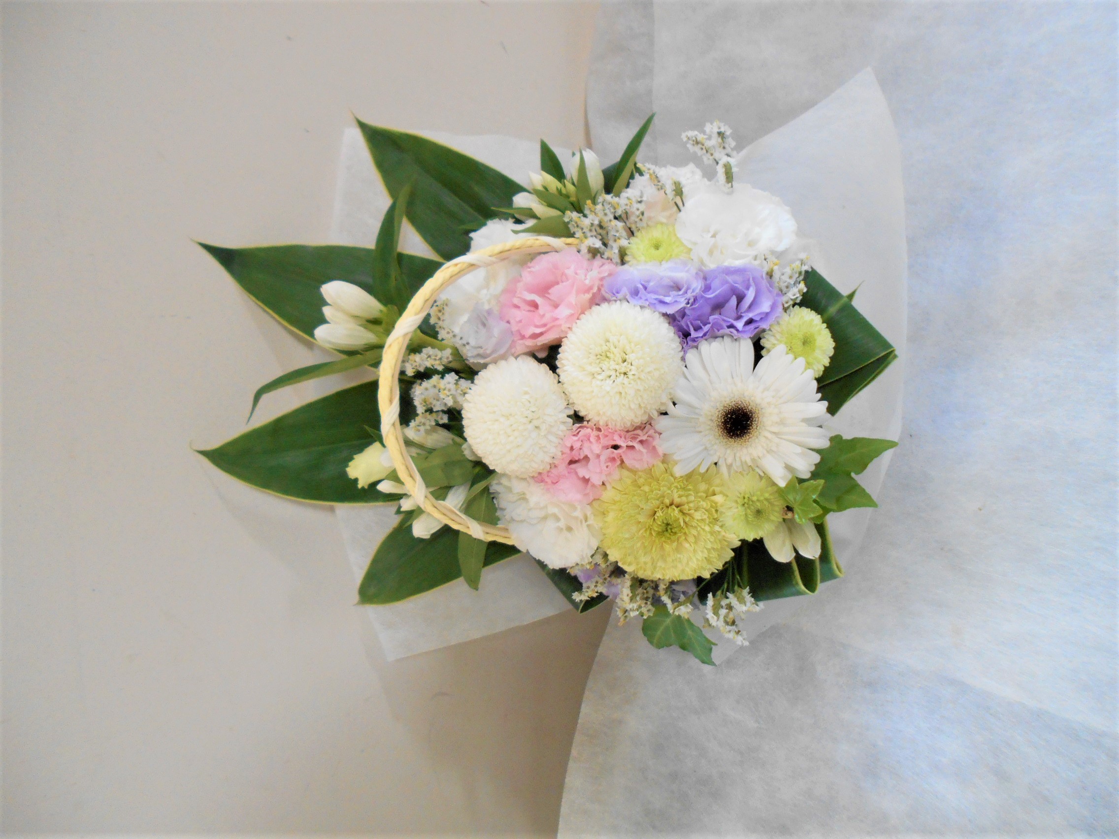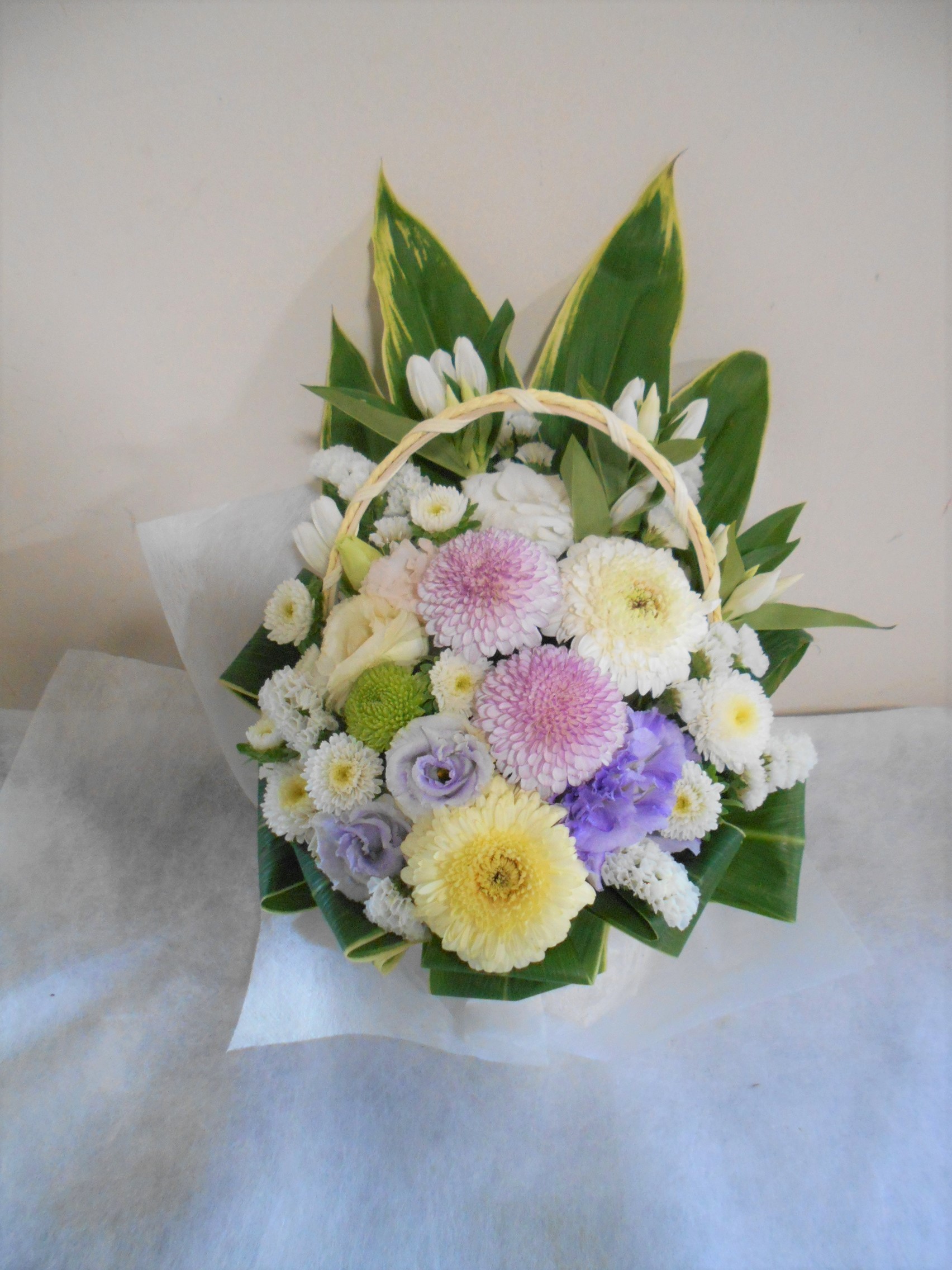 お悔やみ お供えの花 供花 (ホワイト&淡色カラーの手付きバスケットアレンジ)