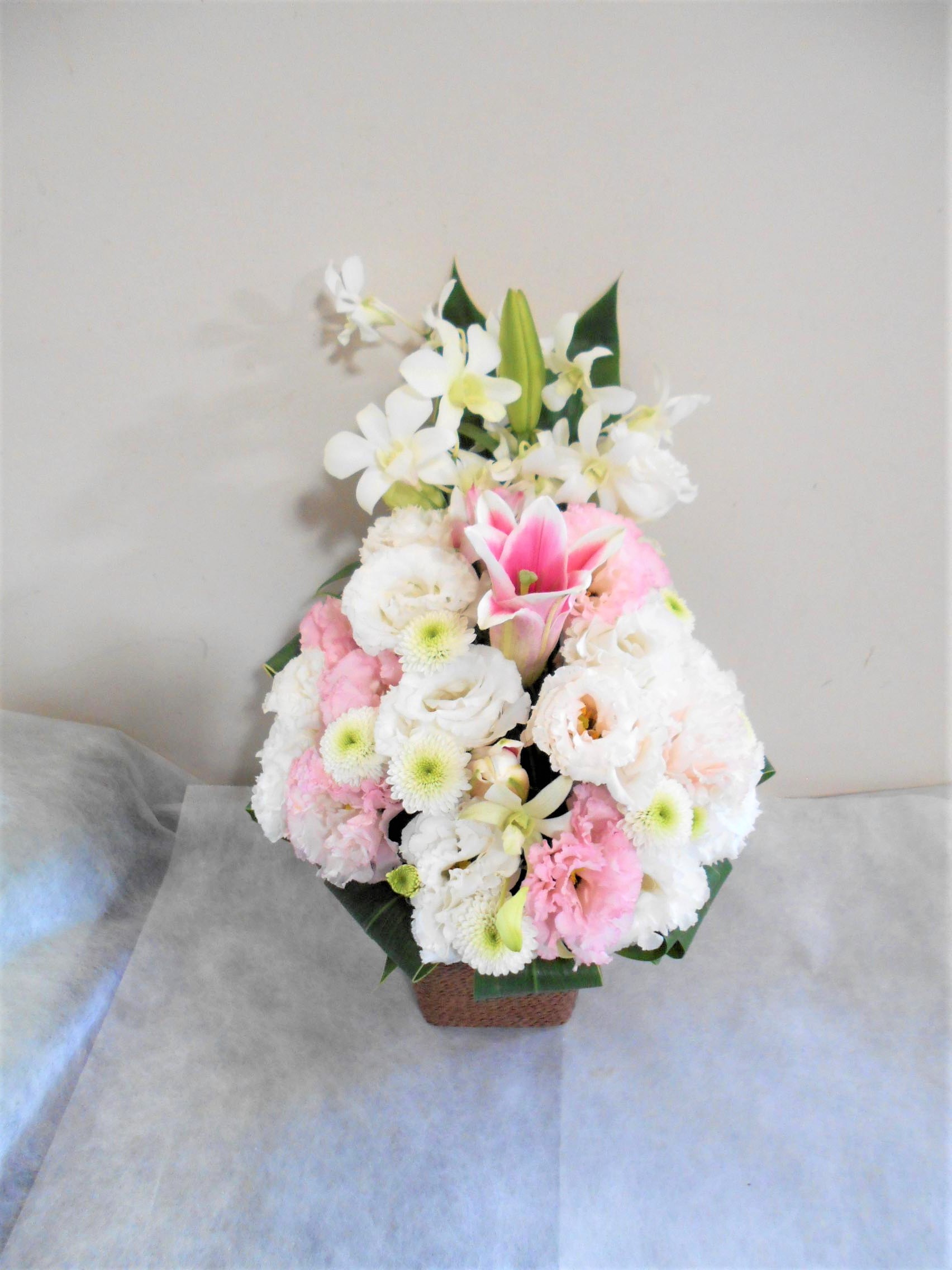 お悔やみ お供えの花 供花 (白ユリをメインにピンクの洋蘭をあしらった高さのあるバスケットアレンジ)