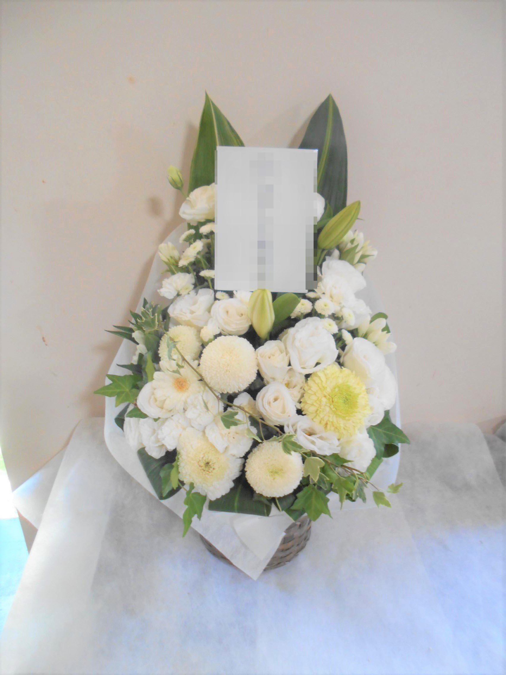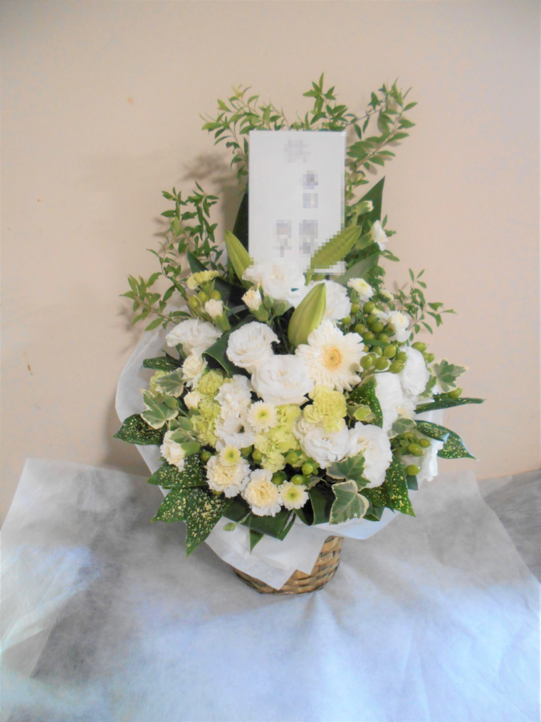 お悔やみ お供えの花 供花 (ホワイト&グリーンを基調にしたバスケットアレンジ)