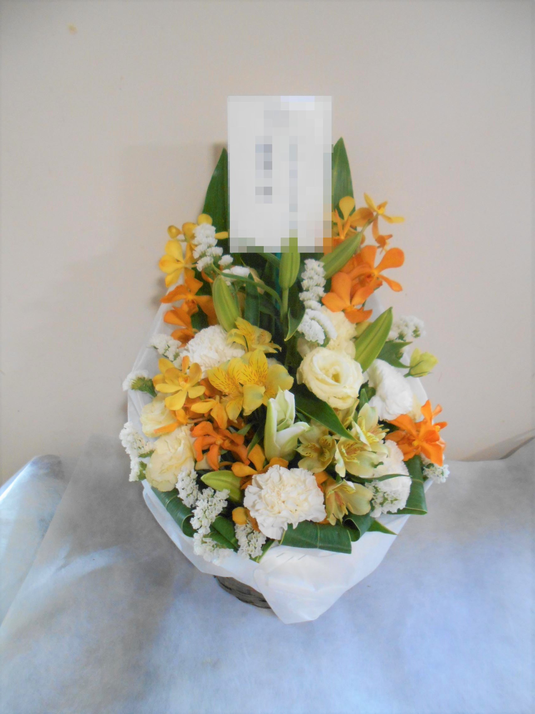 お悔やみ お供えの花 供花 (白ユリをメインに黄色の洋蘭をあしらったバスケットアレンジ)
