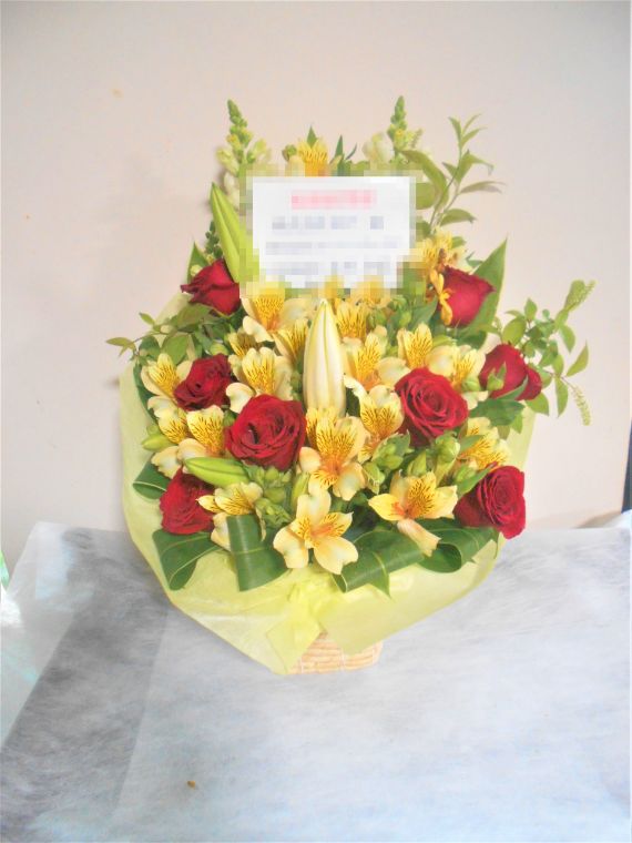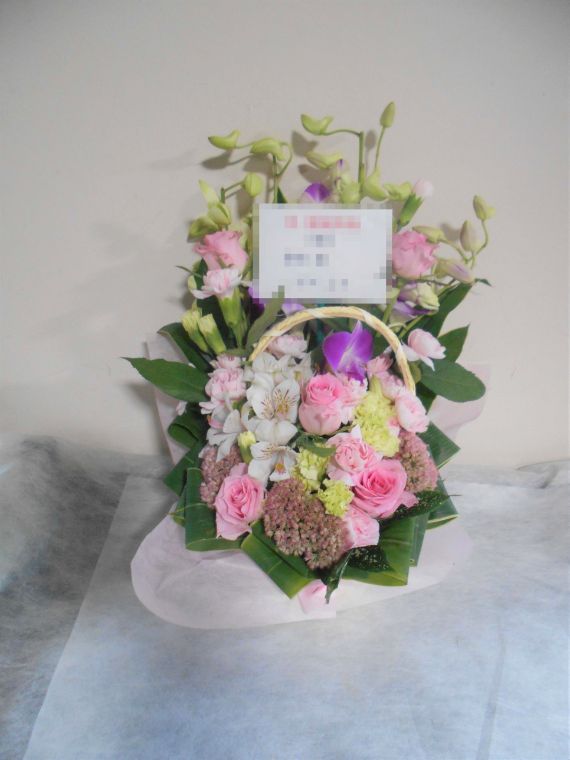 アレンジメントの実際にお届けした写真です。花秘書では発送前に写真をメールで送信致しますので安心して大切な顧客や取引様へのギフトにご利用頂けます。