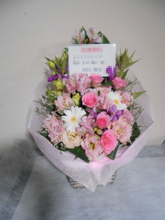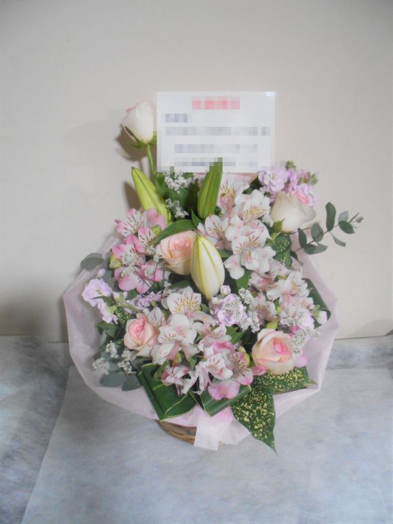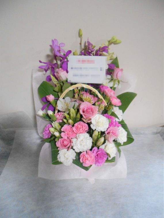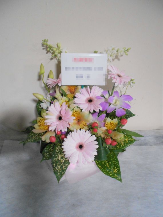 アレンジメントの実際にお届けした写真です。花秘書では発送前に写真をメールで送信致しますので安心して大切な顧客や取引様へのギフトにご利用頂けます。