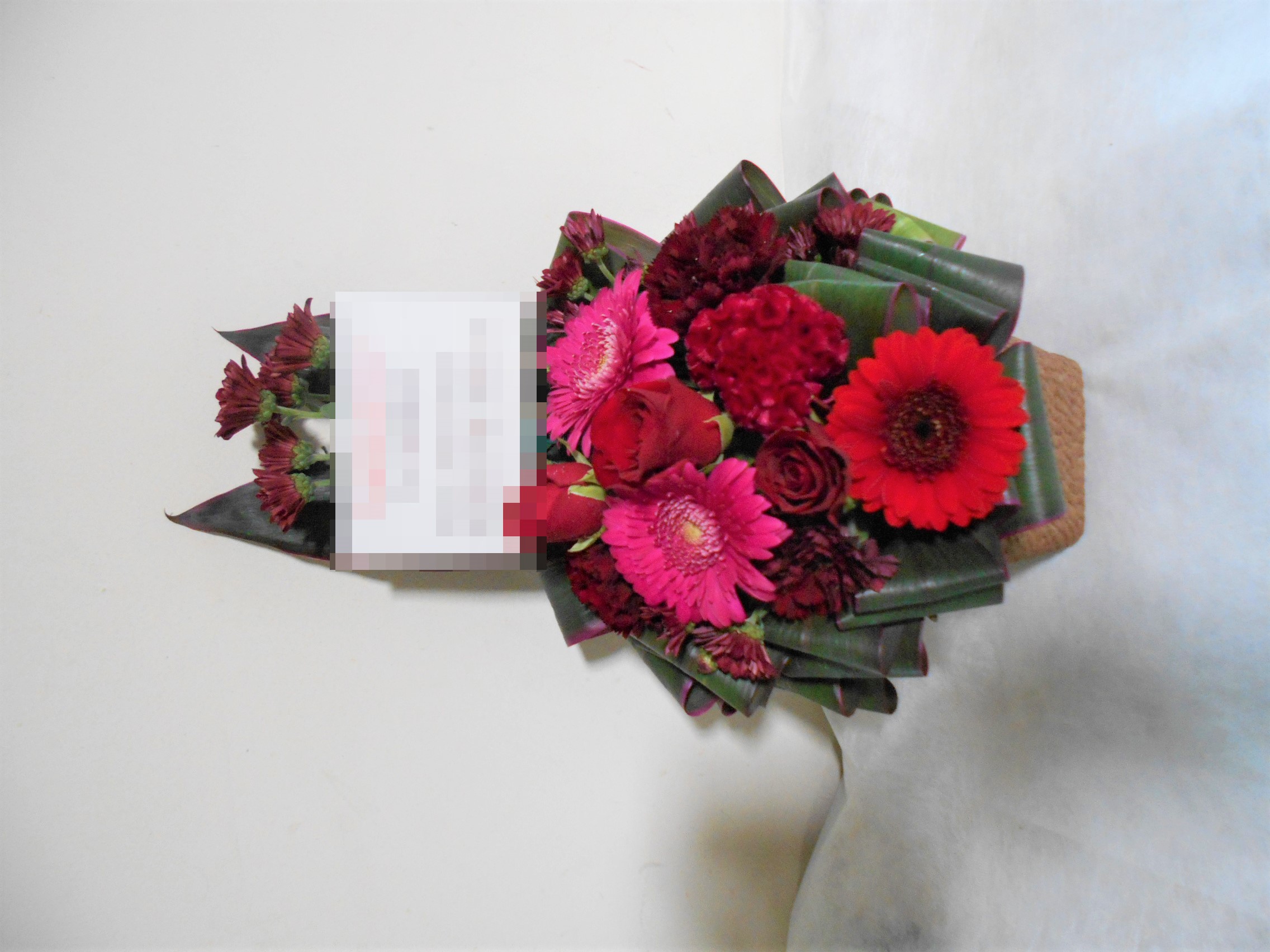 アレンジメントの実際にお届けした写真です。花秘書では発送前に写真をメールで送信致しますので安心して大切な顧客や取引様へのギフトにご利用頂けます。