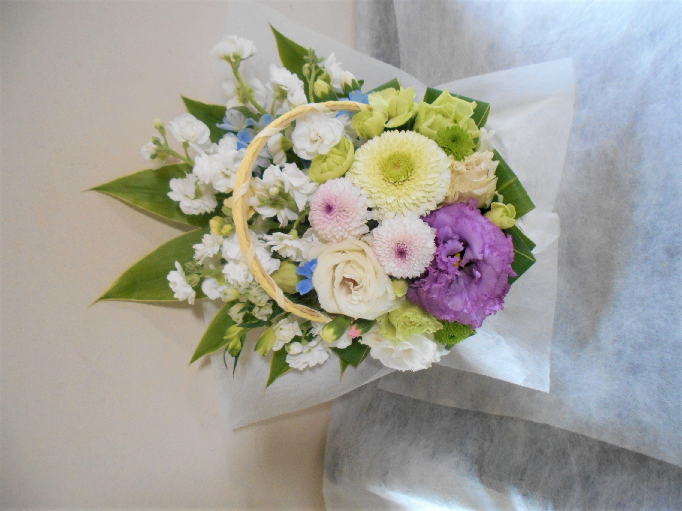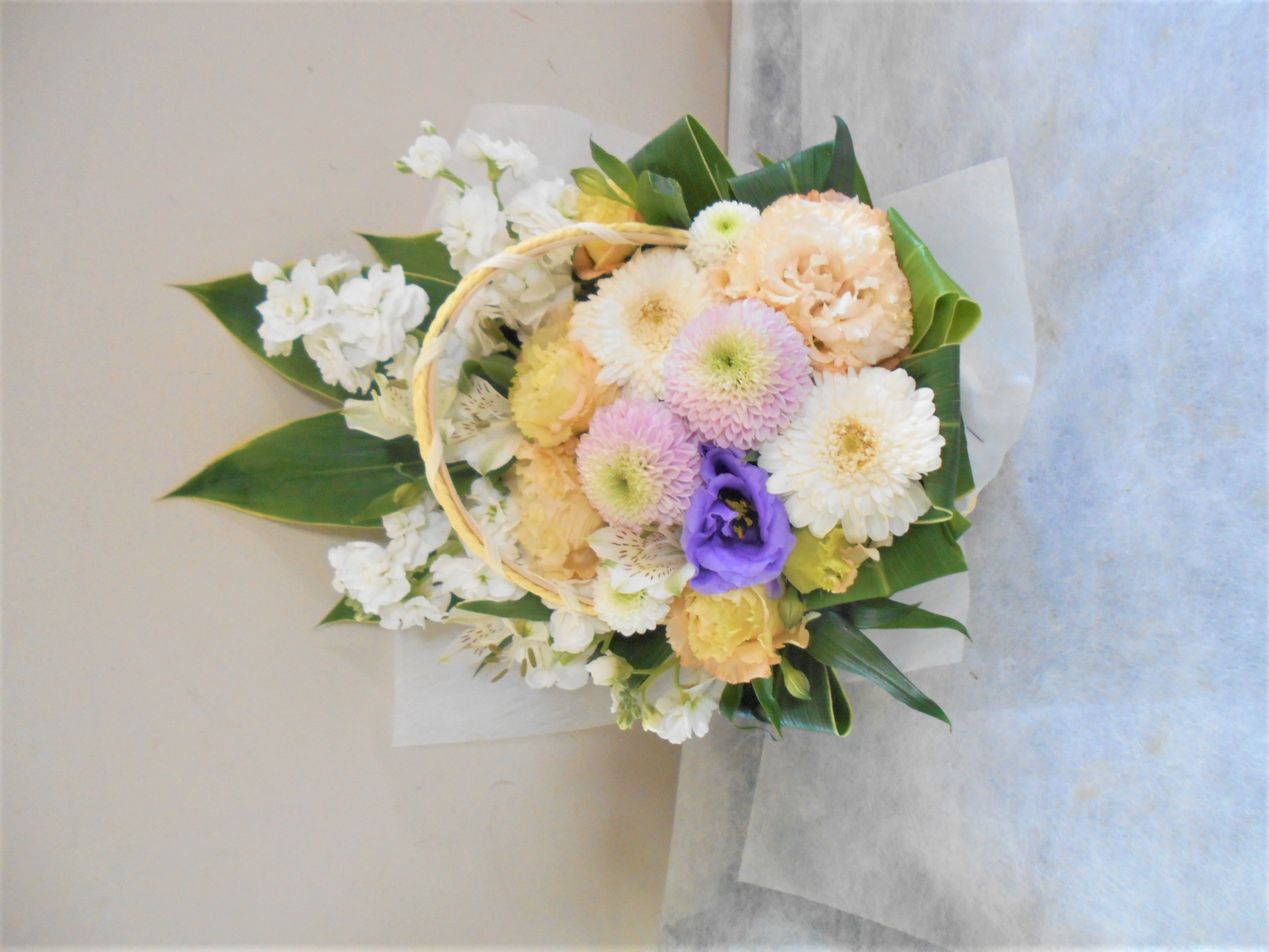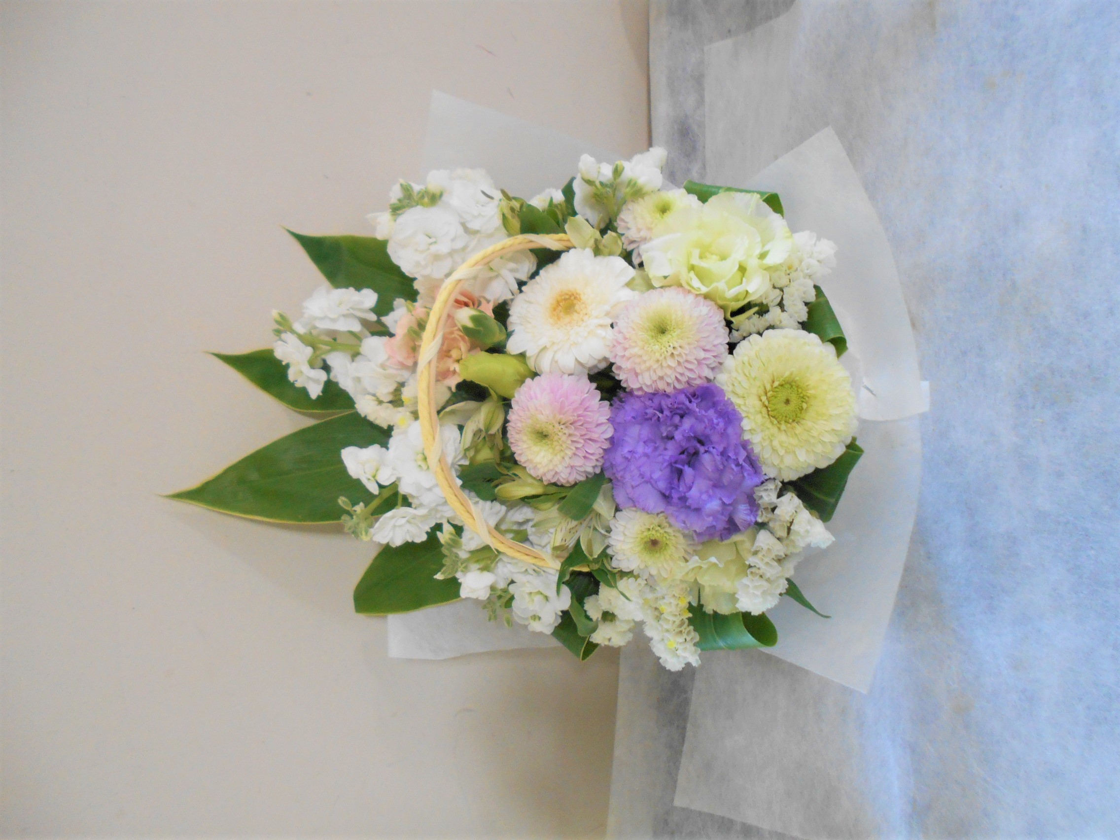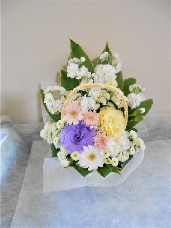 お悔やみ お供えの花 供花 (ホワイト&淡色カラーの手付きバスケットアレンジ)