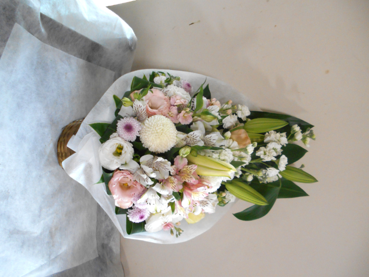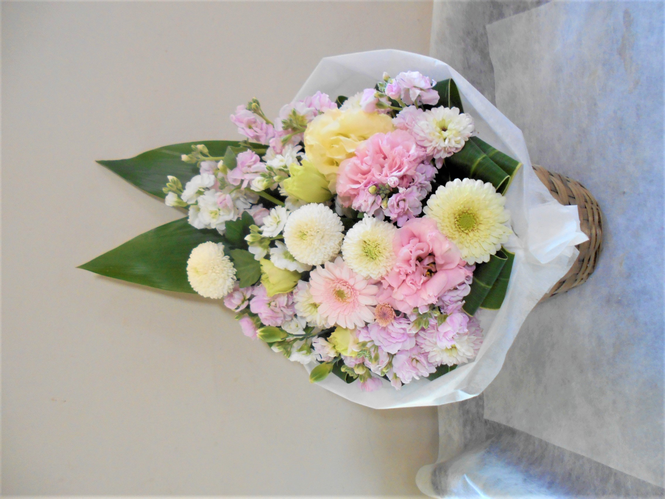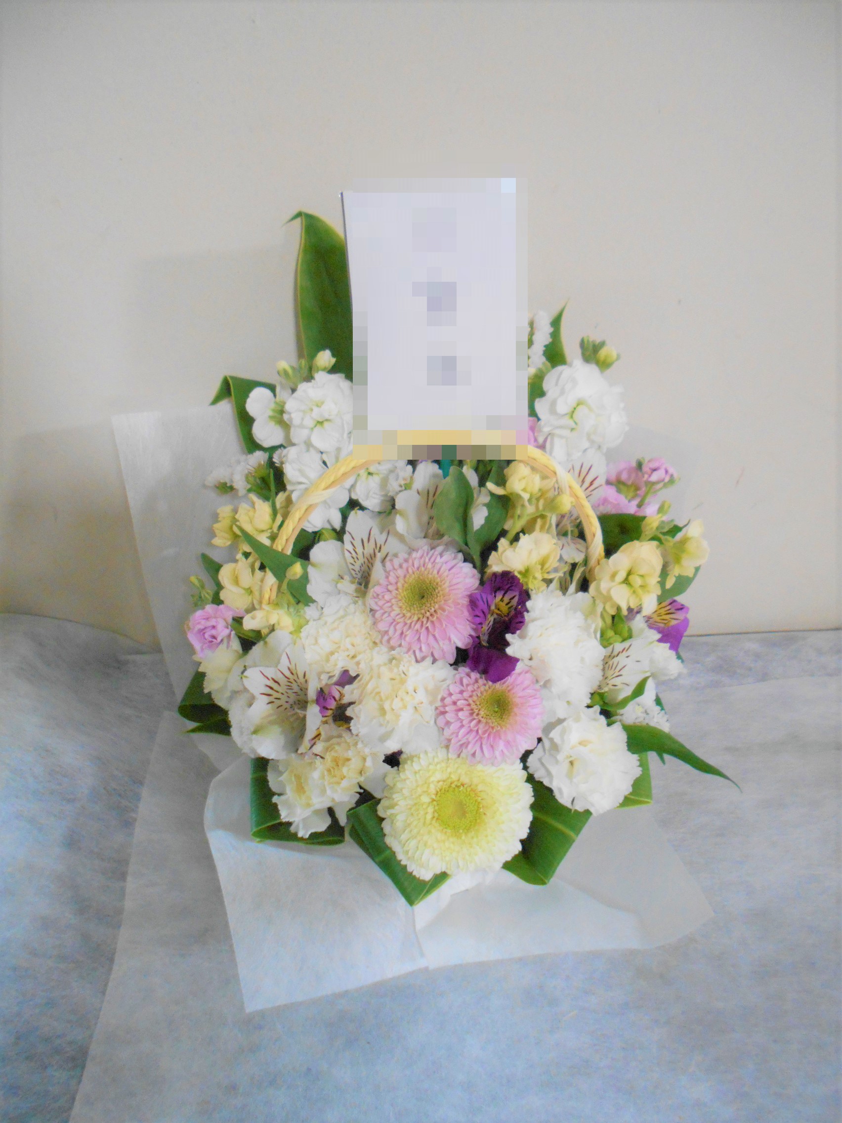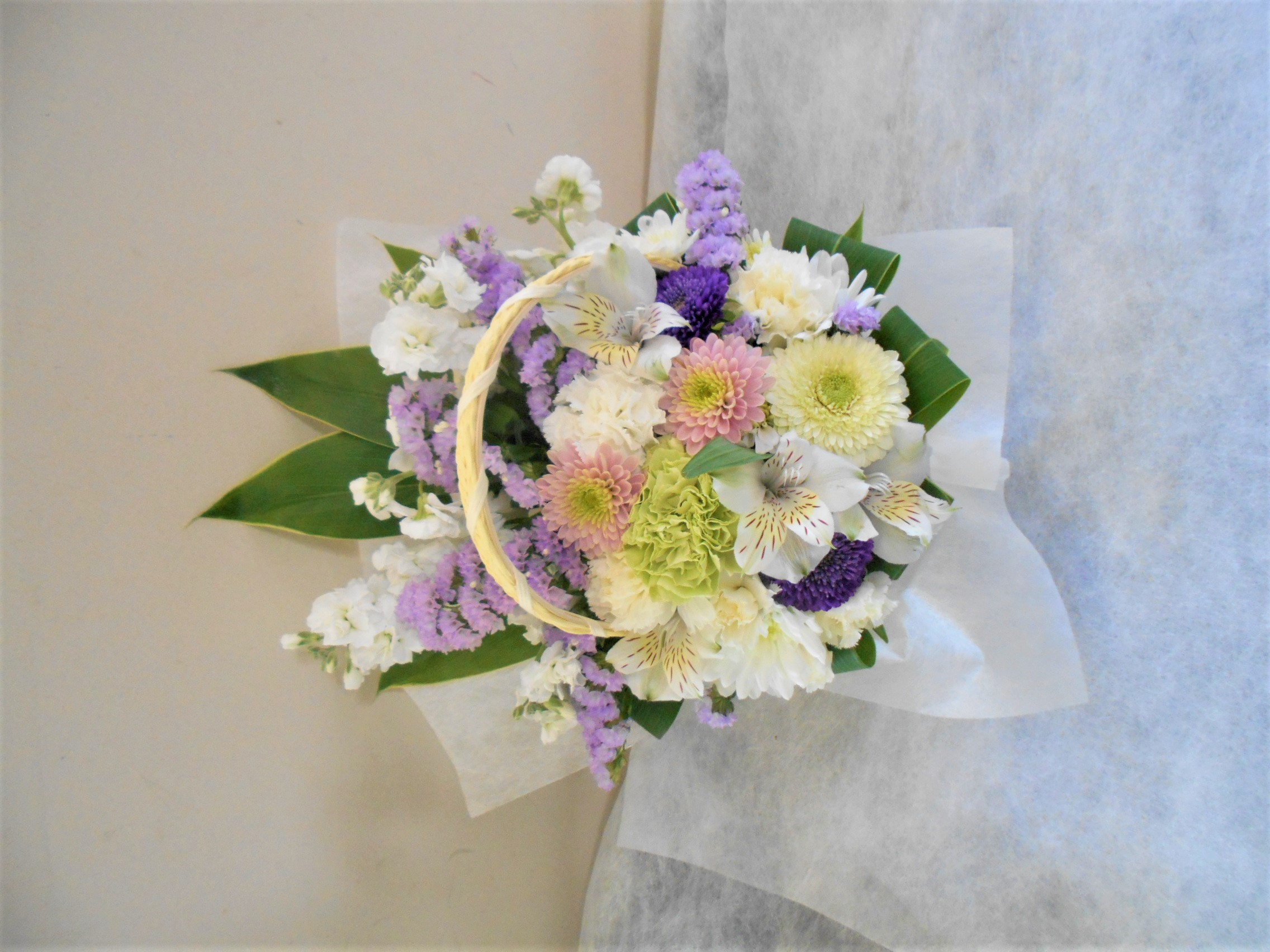 お悔やみ お供えの花 供花 (ホワイト&淡色カラーの手付きバスケットアレンジ)