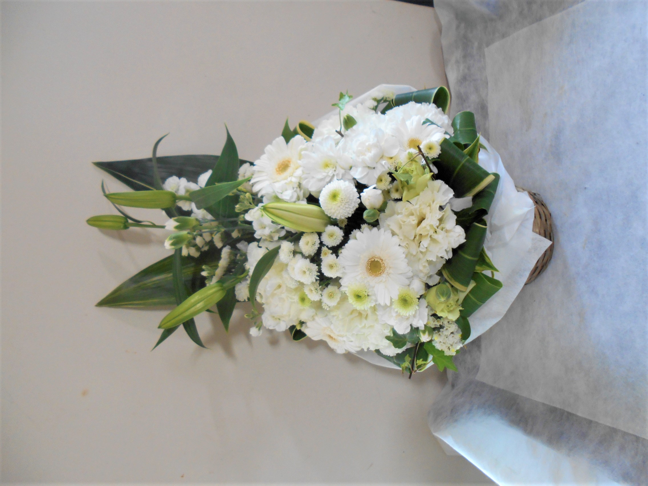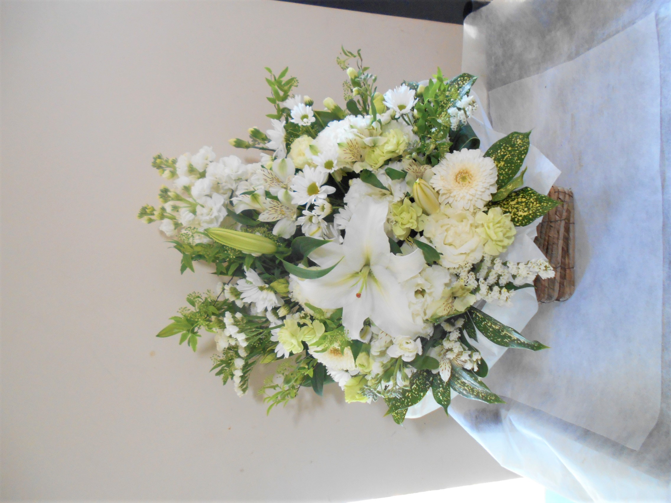 お悔やみ お供えの花 供花 (白ユリをメインにホワイト系でまとめたバスケットアレンジ)