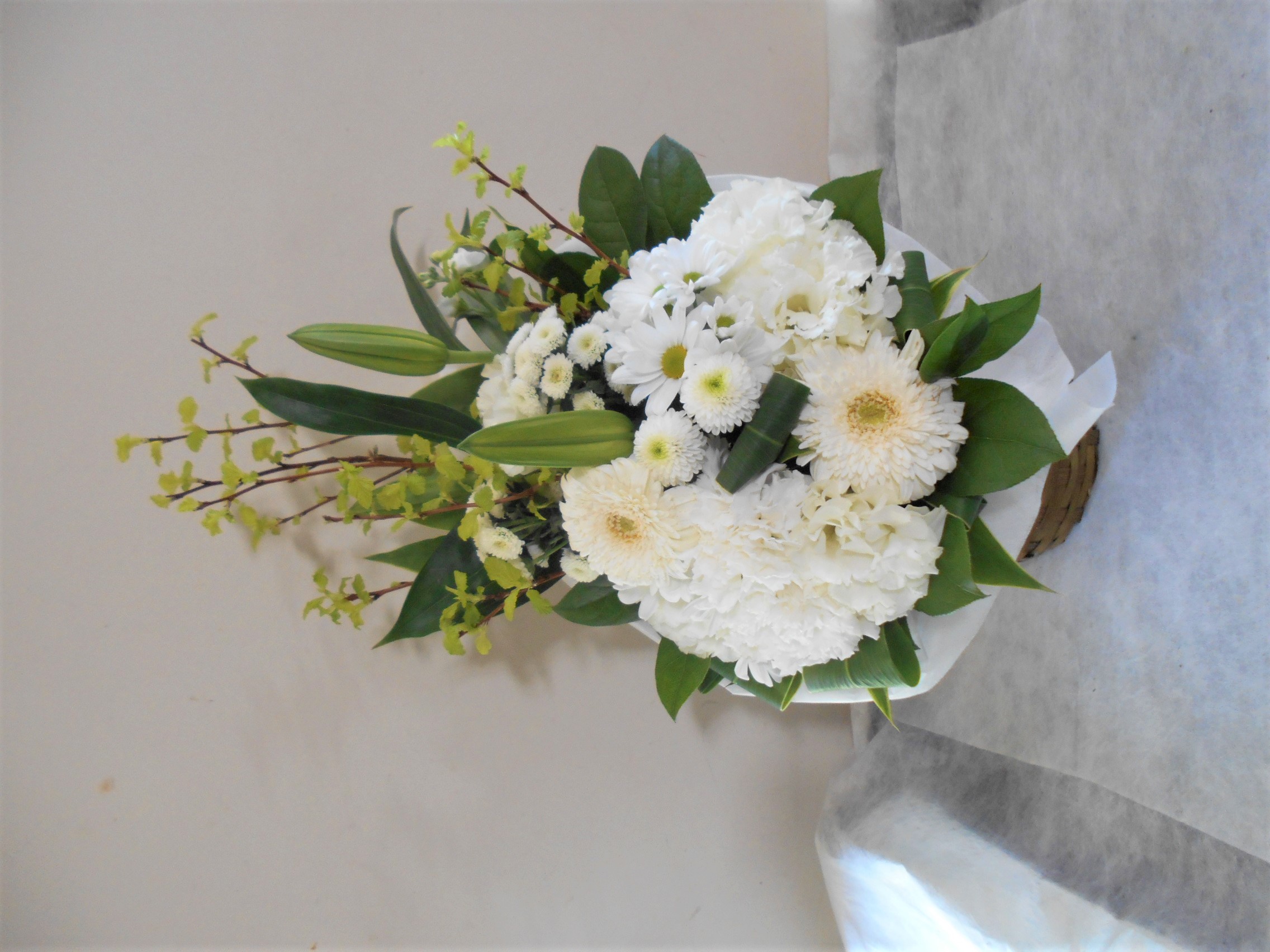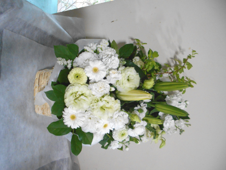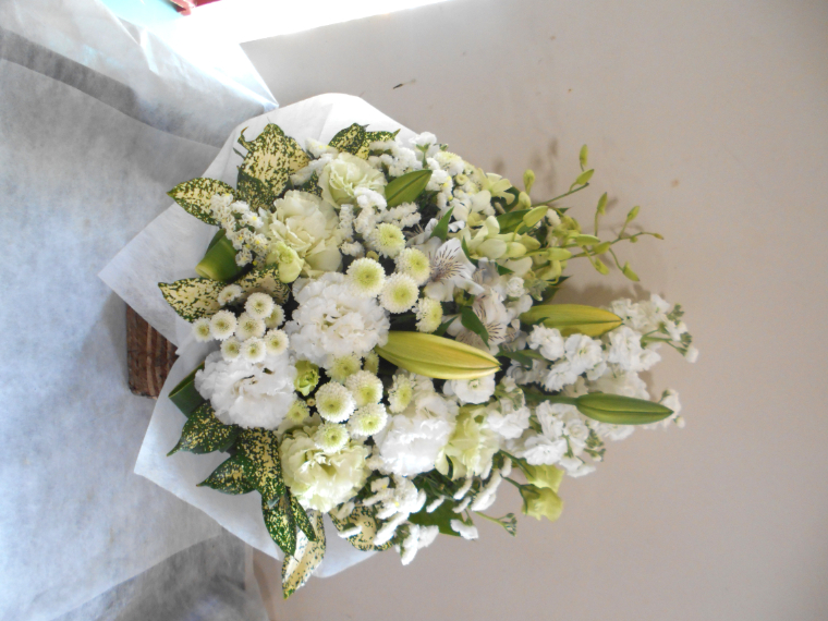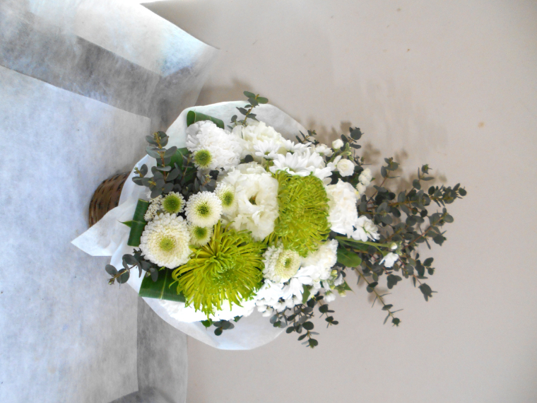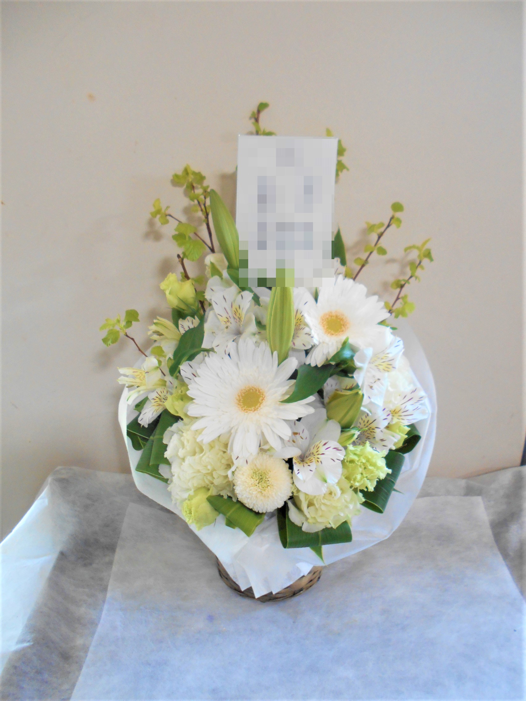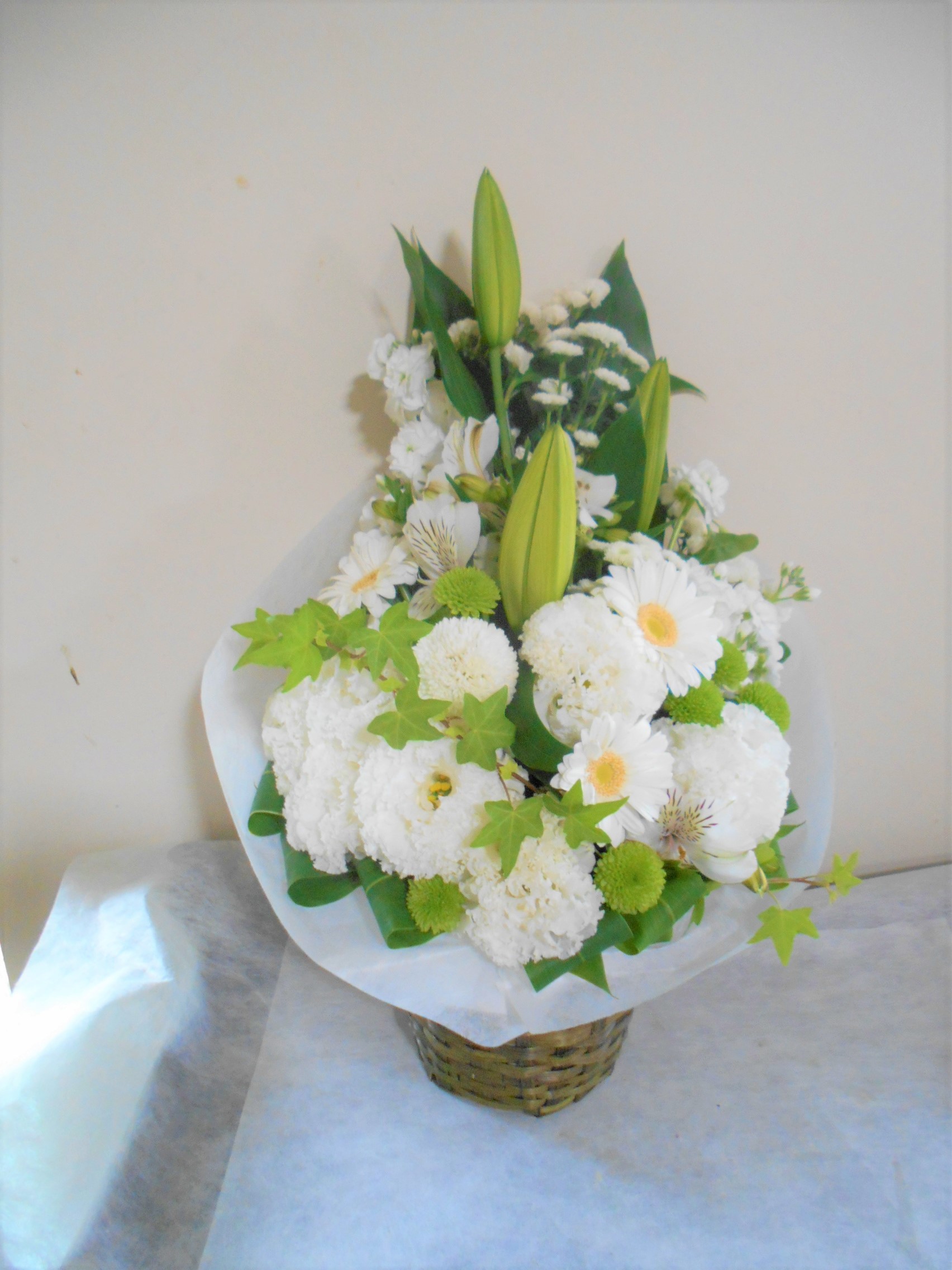 お悔やみ お供えの花 供花 (ホワイト&グリーンを基調にしたバスケットアレンジ)