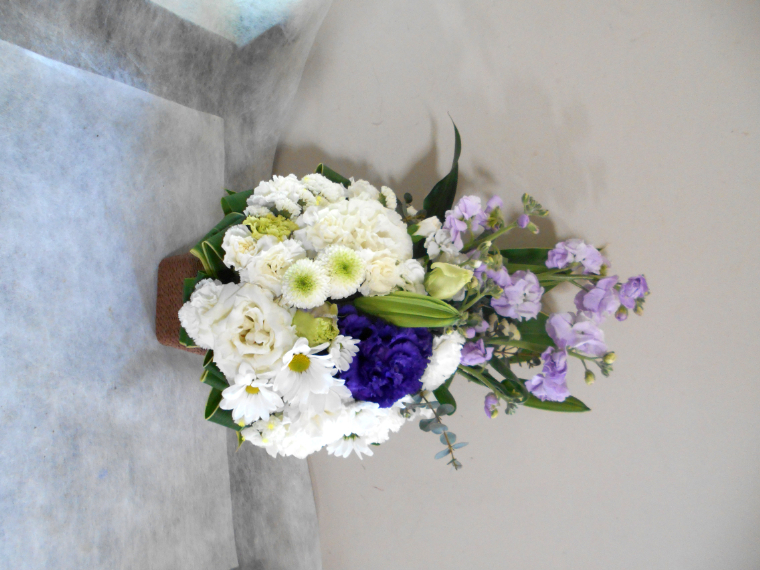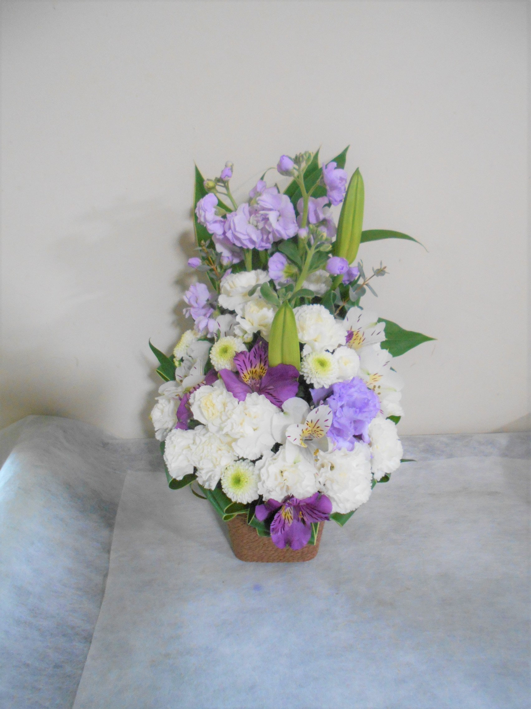お悔やみ お供えの花 供花 (ホワイト&紫系でまとめたバスケットアレンジ)