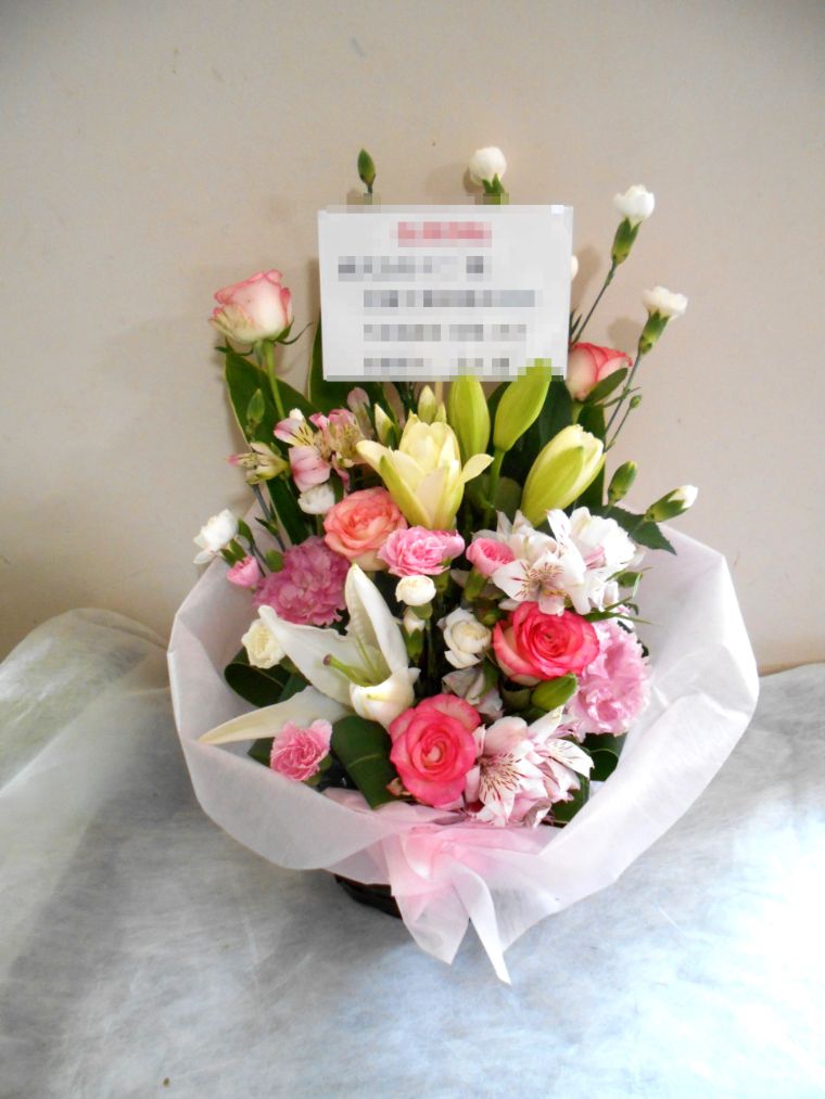 アレンジメントの実際にお届けした写真です。花秘書では発送前に写真をメールで送信致しますので安心して大切な顧客や取引様へのギフトにご利用頂けます。