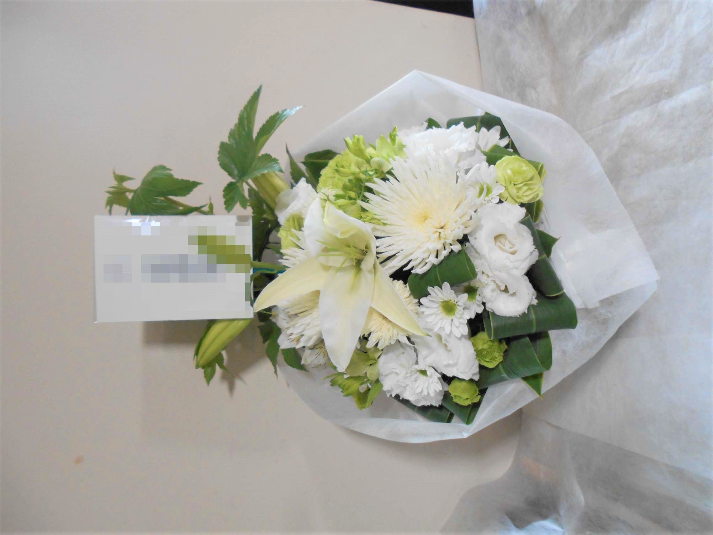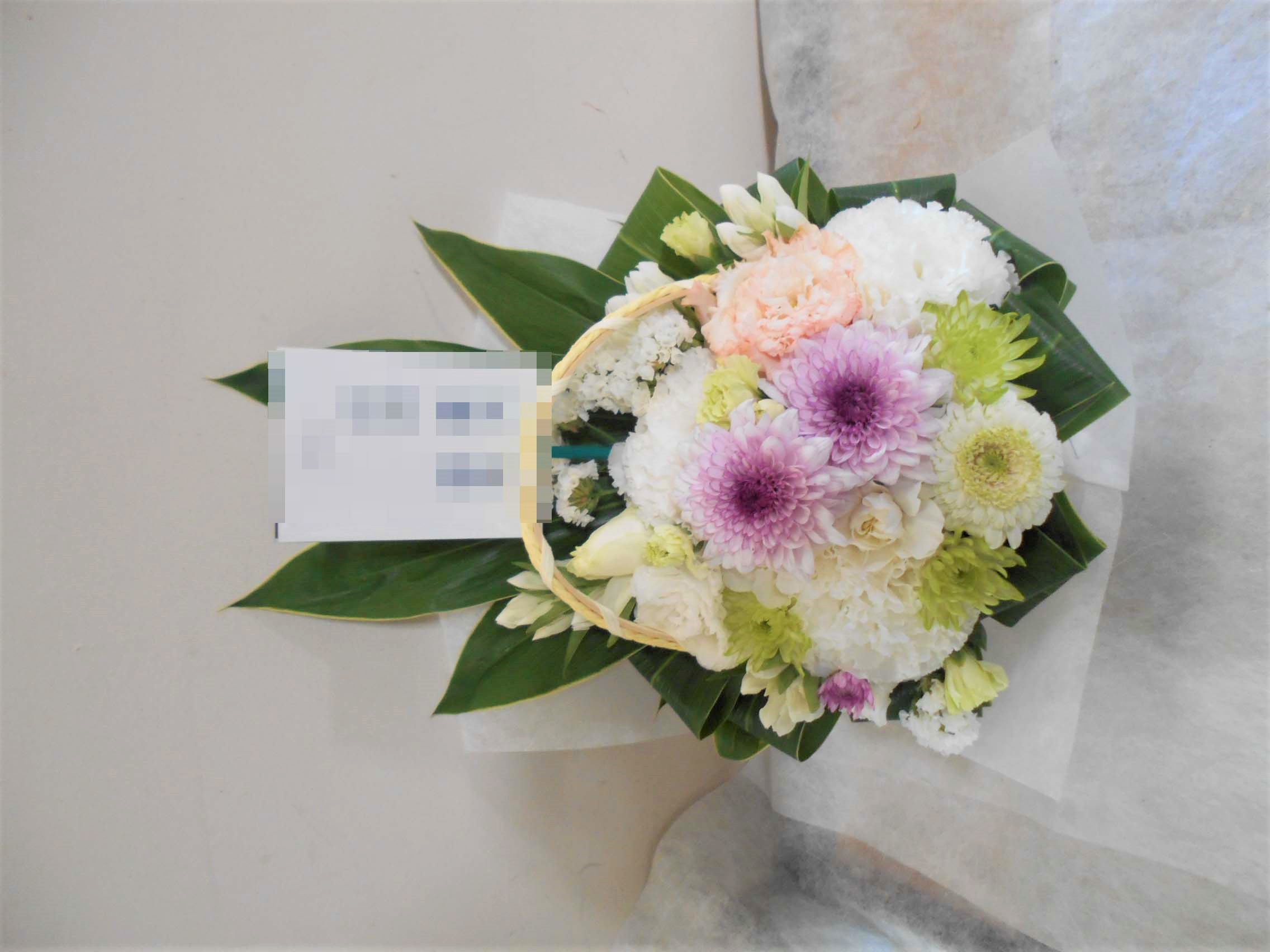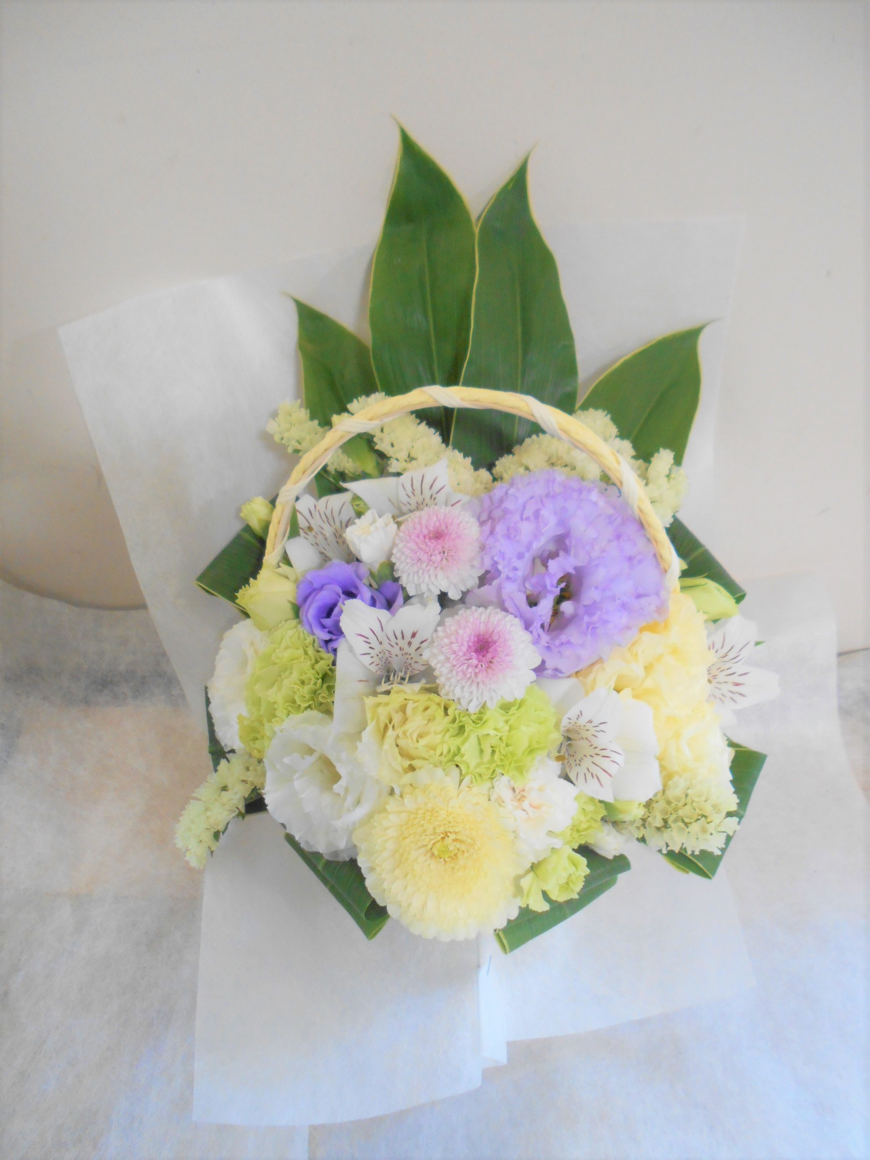 お悔やみ お供えの花 供花 (ホワイト&淡色カラーの手付きバスケットアレンジ)