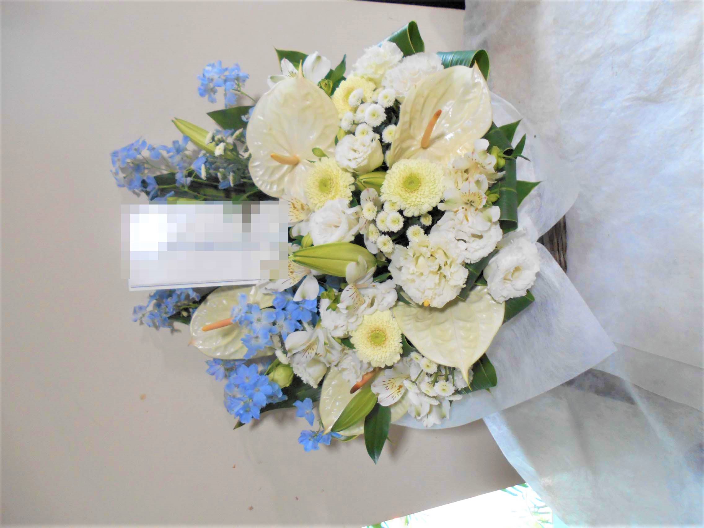 お悔やみ お供えの花 供花 (白基調に青系挿し色をそえたバスケットアレンジ)