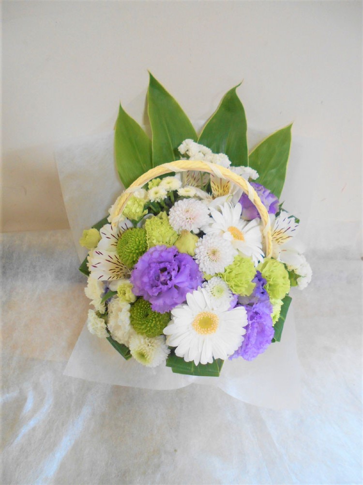 お悔やみ お供えの花 供花 (ホワイト&淡色カラーの手付きバスケットアレンジ)